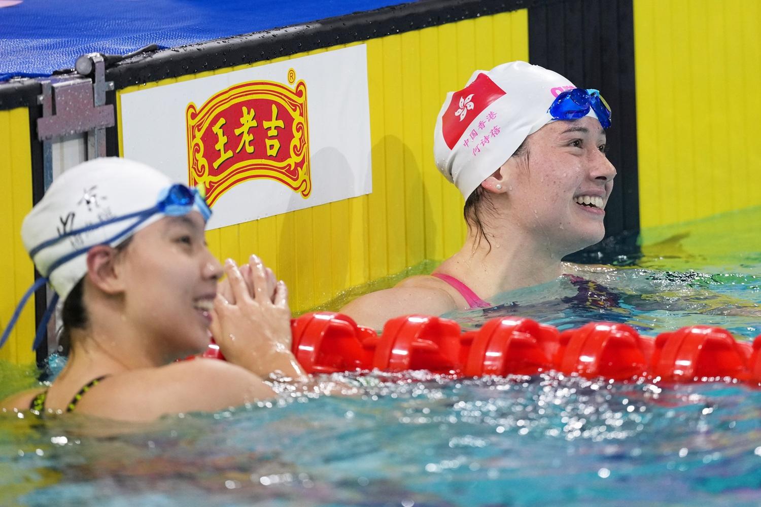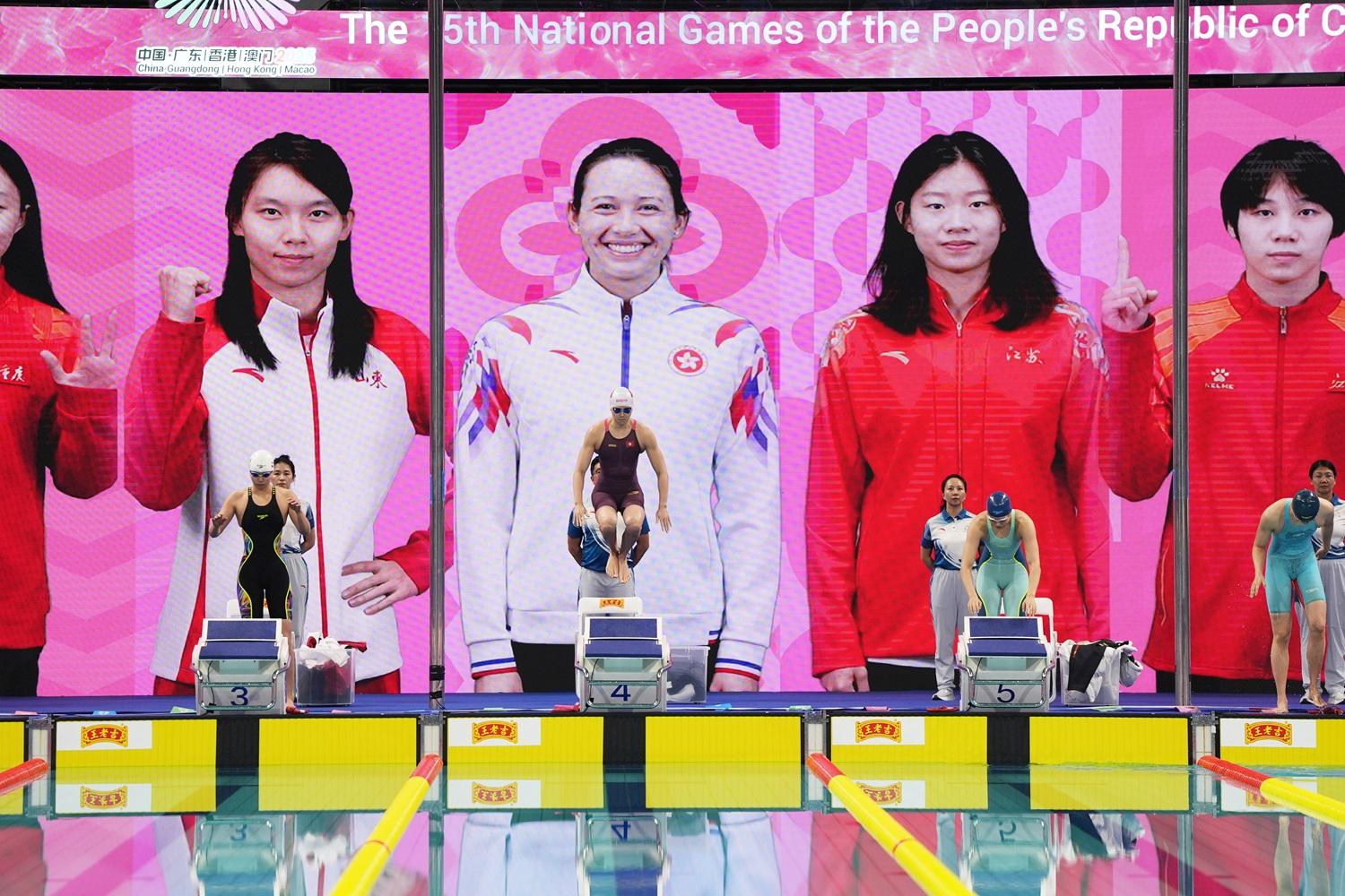 香港游泳代表何詩蓓,在全運會游泳項目的女子100米自由泳再奪得金牌,是個人的第2面,也是香港代表團的第5面金牌。在之前已獲得女子200米自由泳冠軍之後,何詩蓓今日(15日)再於女子100米自由泳的決賽出戰。何詩蓓在沒有太多壓力下,以53秒55的時間贏得冠軍,比第2名山東的楊浚瑄快0.66秒。何詩蓓周日還會參與女子50米自由泳及女子50米蛙泳的預賽。