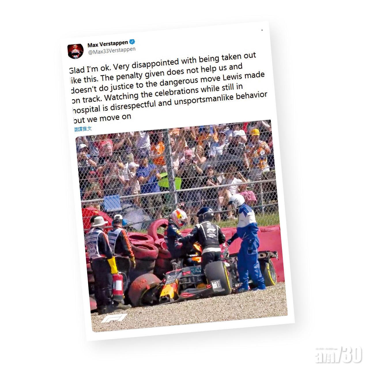 咸美頓賽後如常慶祝奪標,惹來身在醫院的韋斯達本不滿,在Twitter發文批評:「很高興我沒大礙,但我對這情況被退賽感到失望。對咸美頓的處分根本無助於我,而對他在賽場上的危險動作亦沒有公平處理。當我在醫院看着他慶祝,這根本是欠缺尊重與沒有體育道德的行為。」韋斯達本所屬的紅牛車隊領隊賀拿亦狠批「黑帝」的撞車意外是業餘級數,只能慶幸旗下車手未有受到重傷。