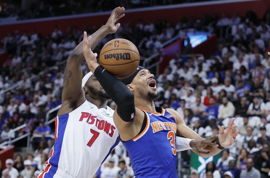 活塞在上一場作客小勝紐約人,令這個系列賽要再打一場。只差一場晉級,紐約人今次不再怠慢,首節一度拉開過14分,以37:23領先。活塞後備球員的比斯利(Malik Beasley)在第2節發威,個人單節獨取15分,為活塞半場反超61:59。紐約人第3節又拉開比分下,第4節中段卻在領先11分之下,被活塞連轟13分再反先。然而在最後的49.8秒,謝倫杜蘭(Jalen Duren)射入罰球令活塞領先113:111。不過米基爾布歷捷斯(Mikal Bridges)上籃得分,幫紐約人追成平手。但之後根寧咸(Cade Cunningham)未能得分下,紐約人取下籃板再叫暫停。之後的攻勢,般臣最後5.3秒3分起手命中,餘下時間活塞未能追回,結果紐約人贏116:113,以場數4:2晉級東岸四強。