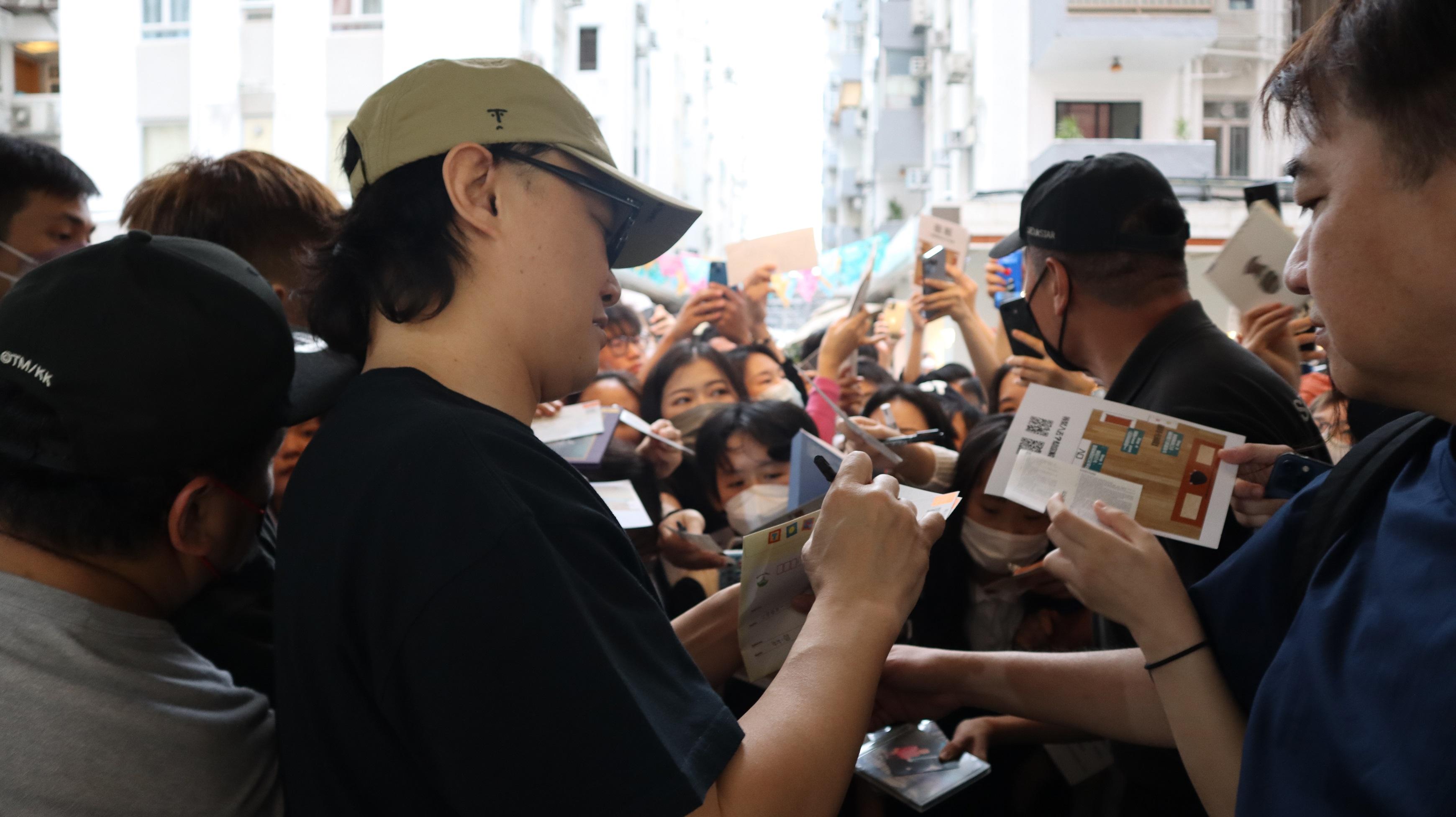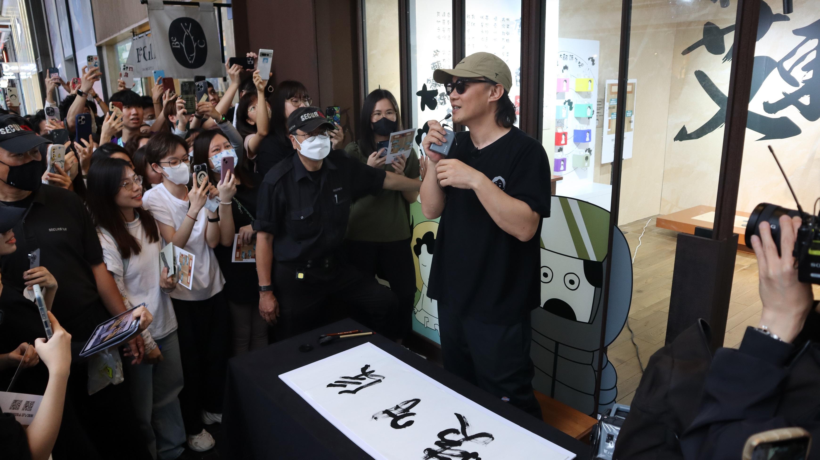 之後他為「塵大館」親手題字作開幕儀式,「等我諗下寫咩,係咪為佢加持比啲好運?哈哈....咁希望入嘅朋友都可以拿到好運帶回家啦!」然後他邊寫邊道,「 我哋做人其實梗係『係咁咦』最開心,哈哈哈!」題下「係咁咦」三個大字後,再高舉給歌迷拍照留念,現場幾百人歡呼及跟著他一起大叫「咦...... 」響遍整條街,氣氛非常歡樂。