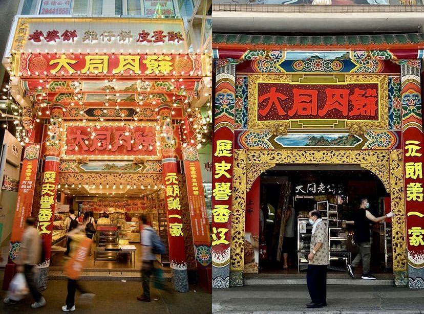 以賣中式糕餅聞名的大同老餅家,元朗總店每逢中秋前夕,門口不但會按傳統豎起保留舊香港特色的中秋牌樓,而且還會配合門外60年代起已懸掛的兩層高霓虹招牌。