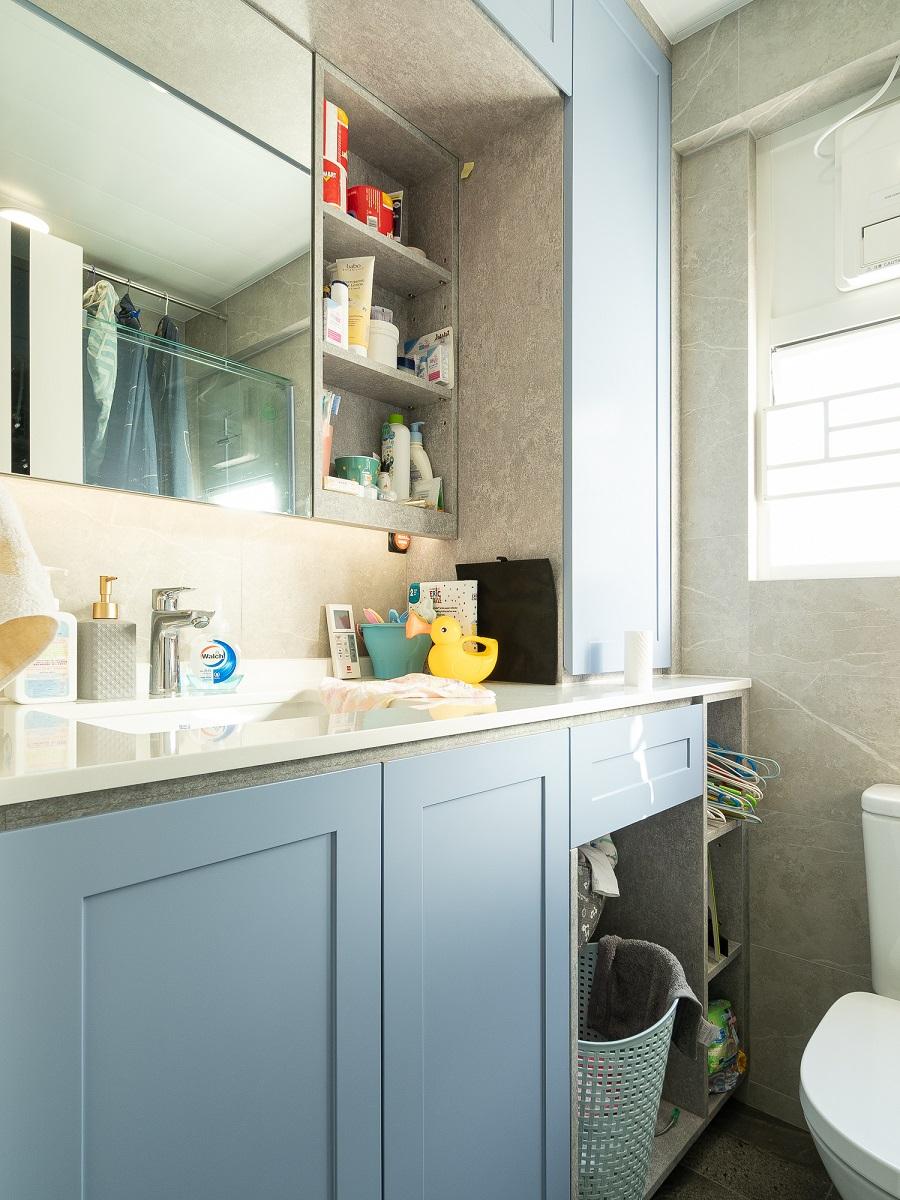 客廳一邊的牆身髹上了粉藍色,與廚房的藍色廚櫃互相呼應,小孩房的床、櫃都沿用了粉藍色,統一全屋的色調,亦增添了單位用色的層次感及活潑感,更有北歐風的感覺。