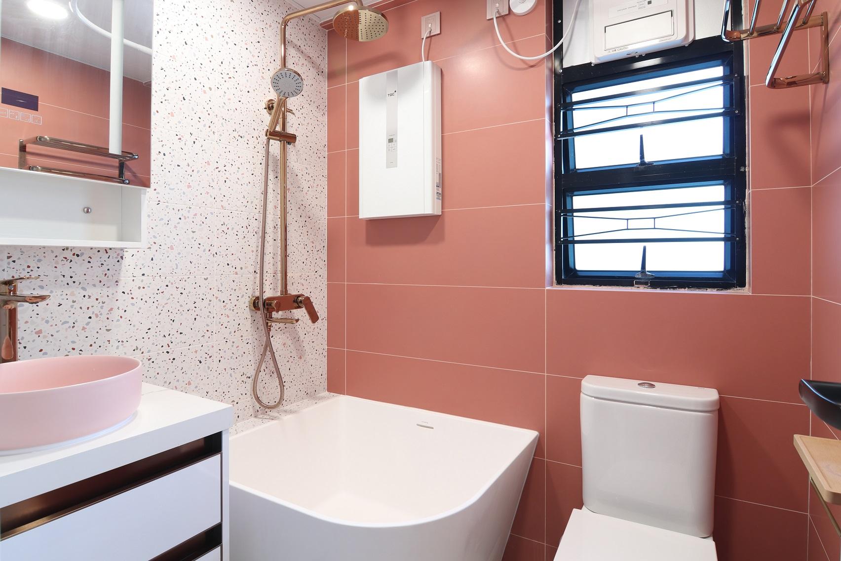 而兩間浴室都有兩種截然不同的設計風格,其中一間用了橙紅色及花磚作為牆磚,引人注目,散發夢幻少女的氣息;至於另一間浴室就鋪了水泥紋的牆磚,走黑白簡約風,現代感較重。