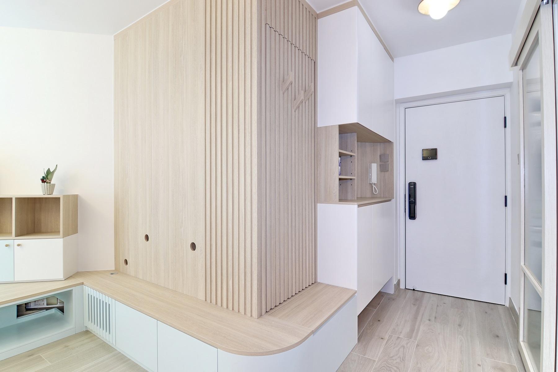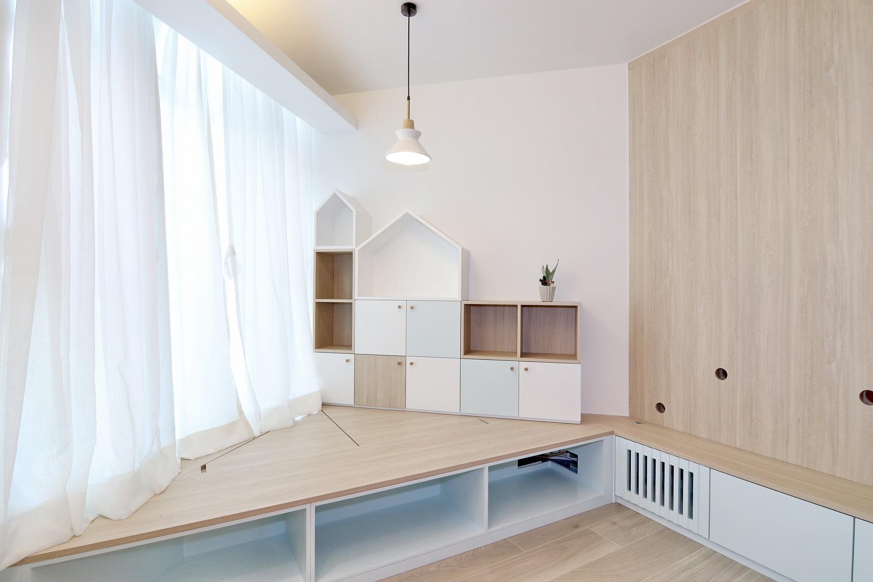 客廳區域其實也是客人今次裝修最滿意的地方,除了拉直了鑽石廳的視覺之外,電視牆亦結合了木紋及木條子兩種材質,豐富了層次感,而儲物室亦大大增加了收納的空間,至於靠近窗台的地台亦有足夠的空間給予小孩閱讀及玩耍,變成了他們的小天地,至於全屋鋪了暖木色木紋磚,極具質感。