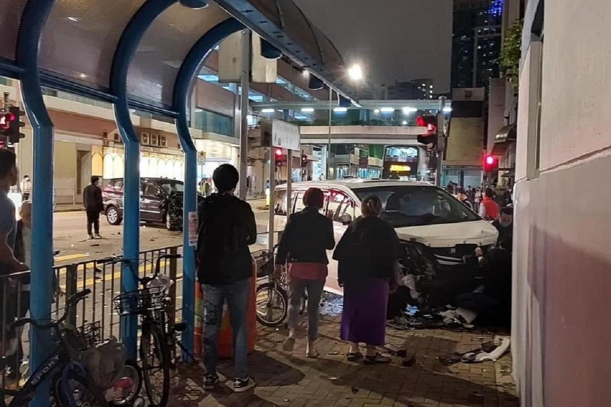 荃灣永順街有兩輛七人車相撞,其中一輛衝上行人路。(FB群組「馬路的事討論區」)