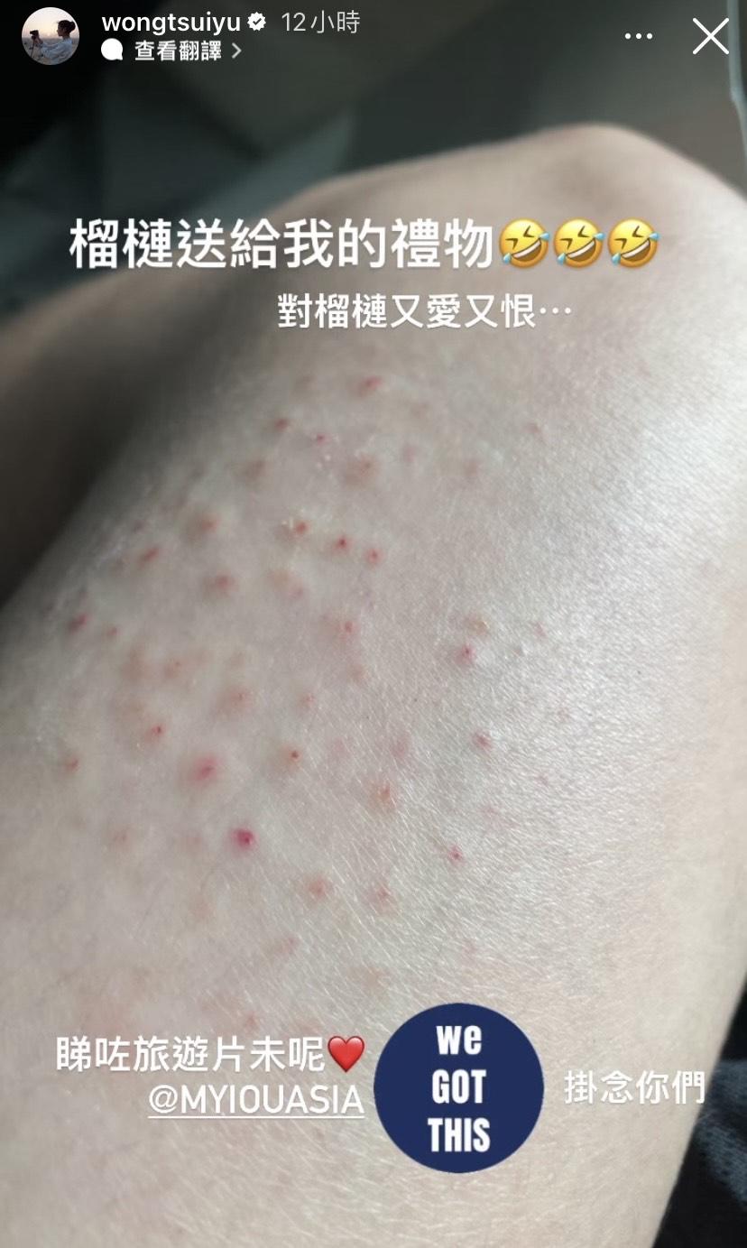 其後翠如便在IG限時動態公開傷勢,表示:「第一次被榴槤掟中腳,大髀開了20個窿」、「對榴槤又愛又恨」,相中見她的白滑美腿佈滿一點點紅血絲的傷口,網民見狀紛紛留言大嗌心痛,更表示:「好痛」,翠如亦有回應謂:「超級痛」,亦有人笑言:「如果以控球來講,好腳法」,而陳敏之就留言大讚:「真心好鍾意睇你做旅遊節目」。