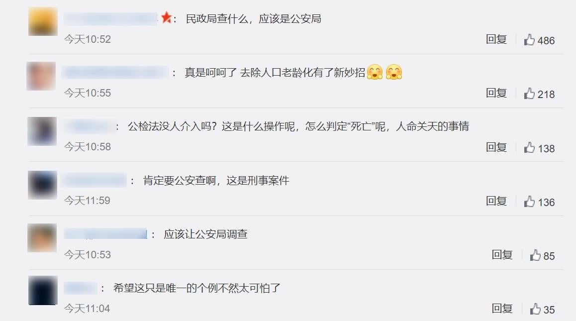 內地網民對事件極為震驚和憤怒,直言「這是殺人,別搞甚麼疏忽道歉了」、「這是道歉就可以解決的問題麼?」、「還好熱心人拍了視頻,不然真的說不清楚。活這麼大,也算長見識了」、「比這更讓我生氣的是福利院工作人員的下意識動作,當發現活著的時候繼續把毛巾蓋在別人臉上」。有網民就質疑,「關鍵死亡證明書哪裡出的?哪個醫生開的?」、「這個福利院恐怕不是第一次幹這種事情」。還有網民感慨,「昨天看到新聞覺得像假的,但是今天實錘……作為已經在小區封閉了52(天)的我們來說,已經不知道上海的底線是甚麼」、「上海這幾個月比過去兩年的奇幻新聞加起來都多」。