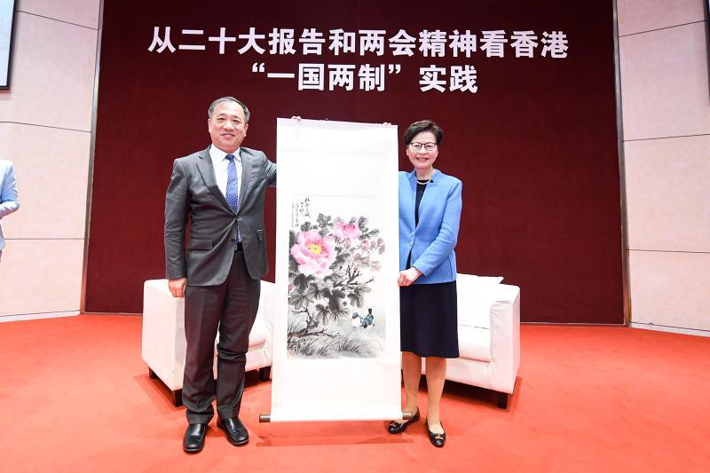 林鄭月娥分析香港過去幾年發展中存在的問題,表示香港會在中央的大力支持下,堅持「一國兩制」正確軌道,發揮科技、金融、貿易等方面優勢,把握「二十大」和「兩會」帶來的發展機遇,積極融入國家發展大局,以「一國為本、一國”為根」,以「愛國者治港」,堅持、堅定地維護國家主權、安全、發展利益,維護香港的穩定、發展和繁榮。