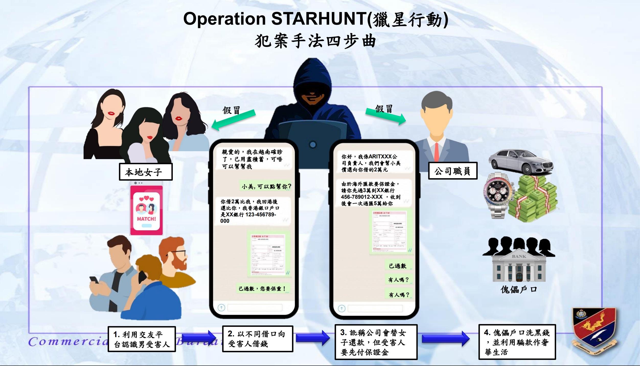 警方指,集團主腦有黑社會背景,利用傀儡戶口所洗回來的騙款過著奢華生活,並以月租近20萬元,租住何文田一個複式單位作為住所及基地,警方在作動中搜獲約60萬現金、名錶、大量電話及電腦,以及扮演情人的對白及講稿等。警方行動仍在進行中,不排除會有更多人被捕。