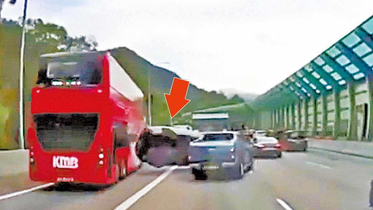 一輛260X線雙層九巴昨早8時49分沿屯門公路往荃灣方向行駛,途至青龍頭對開,一輛私家車由快線連切兩條行車線擬駛向最左邊巴士專線。駛至的九巴收掣不及猛撼私家車,私家車先擦撞向右邊一輛農夫車,再失控翻筋斗,四輪再着地後,橫亘路中。