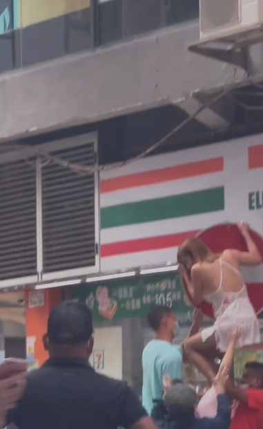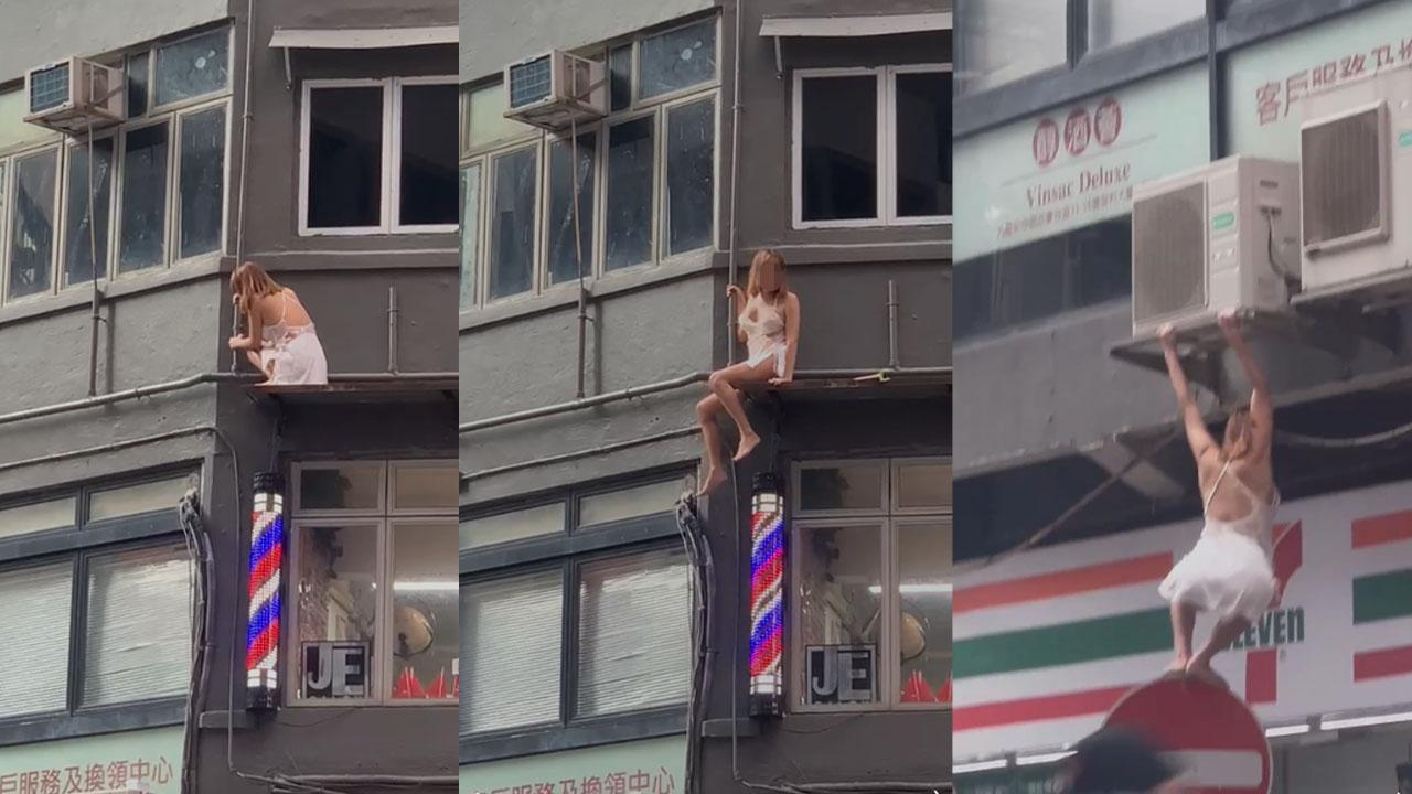 據現場市民拍攝的影片可見,該「女子」身處大廈外牆簷篷,不時望向大廈玻璃窗,似在逃避追捕。她(他)曾嘗試利用外牆的電線「借力」往下,可惜未能成功。及後,她(他)爬到下一層的冷氣機,再雙手拉著冷氣機的支架,打算跳落地下。當時已有幾位熱心市民上前,預準將她(他)接住。之後該「女子」改為跳到交通指示牌,並在市民協助下,終於能夠回到地下離開。