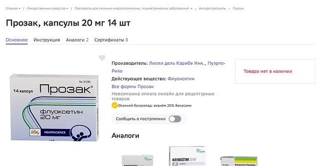 俄羅斯自去年2月攻打烏克蘭後,抗抑鬱藥Prozac出現短缺。俄羅斯報章《RBC》稱,截至9月15日,莫斯科近2,400間藥房僅4間有Prozac供購買,聖彼得堡1,300間藥房亦僅2間有貨。在新西伯利亞和喀山地區甚至沒有貨。當地一間最大連鎖藥房向該報承認Prozac缺貨,現在出售的是剩餘存貨。另有消息人士稱,最後一批Prozac的交貨日期是7月。