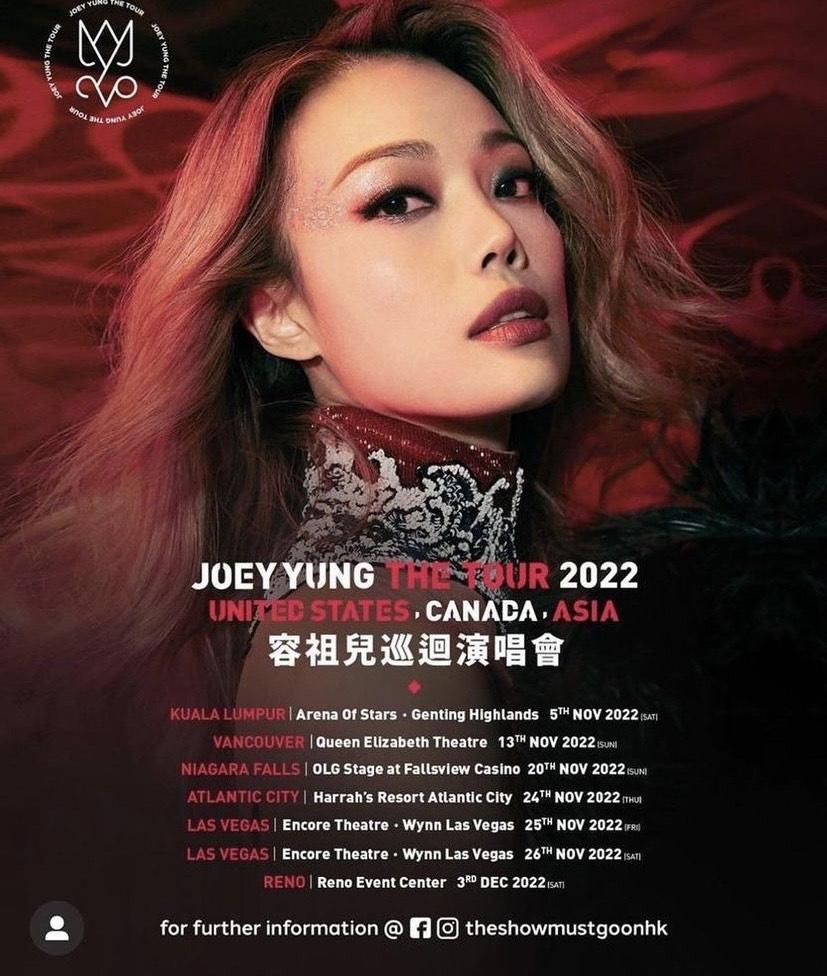 天后容祖兒(Joey)從內地回港休息近兩個月後,今日(1日)便出發重啟因疫情一直延期的巡迴演唱會,她在社交網開心分享於香港機場的照片,相中除見心情大靚的Joey曬出自拍照,更難得的是此行有容媽媽同行飛往馬來西亞,Joey開心寫道:「一切順利 #joeyyungthetour #容祖兒巡迴演唱會loveingenting雲頂站!」好姊妹蔡卓妍亦有留言:「Safe trip!」而Joey完成本周六(5日)的雲頂站後,接著將會到加拿大及美國,共七場的巡迴演唱會。