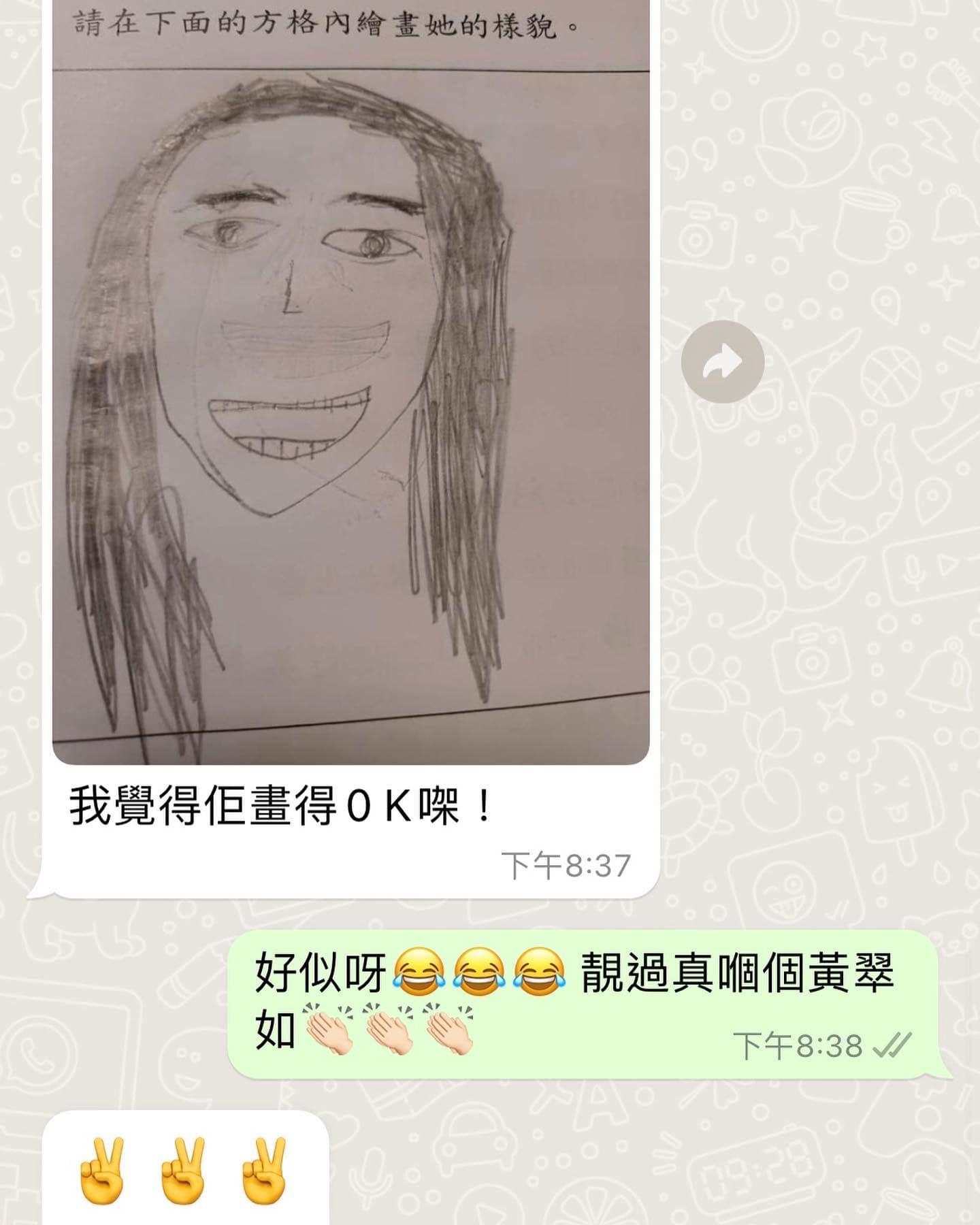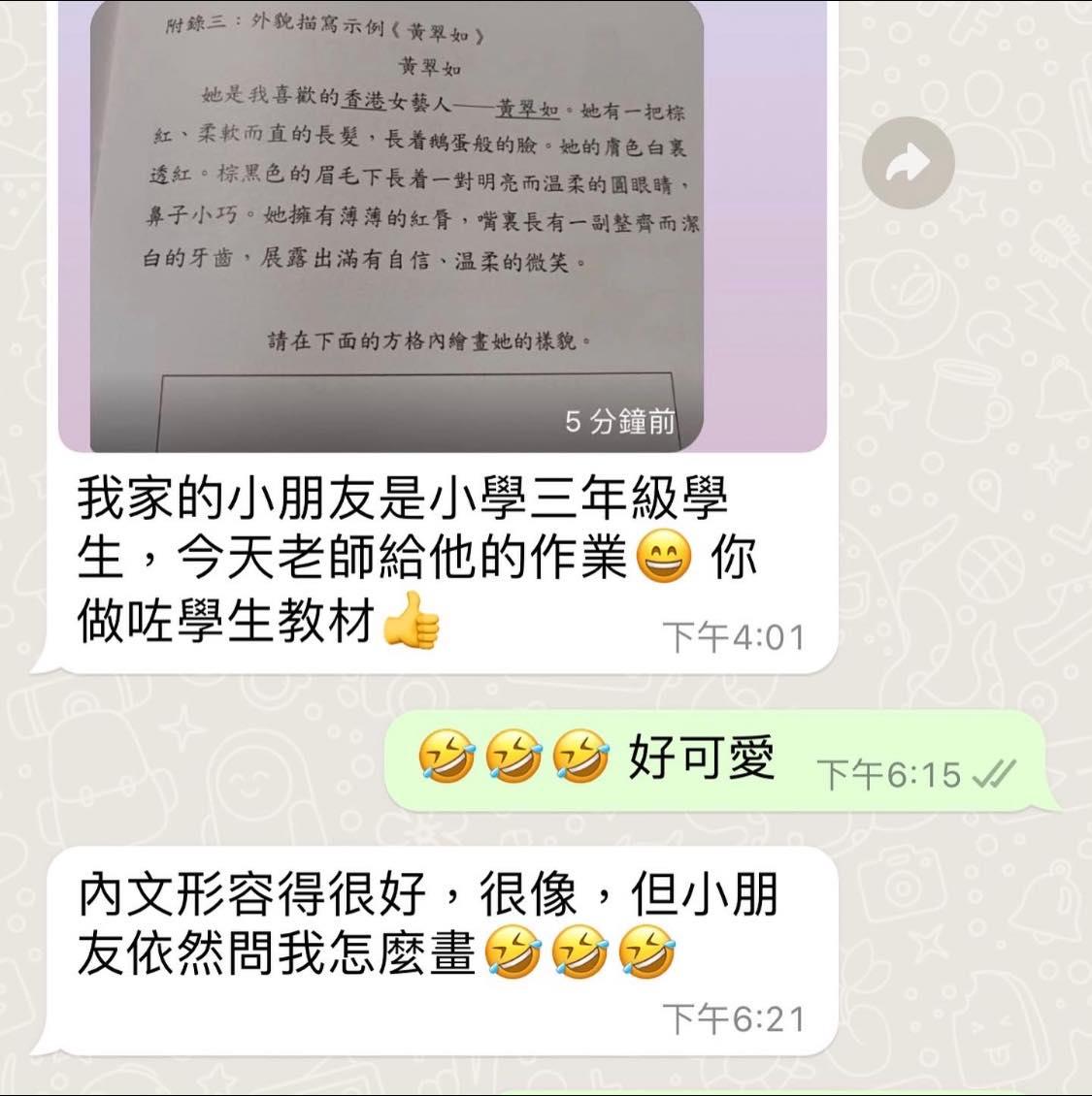 對話截圖見到一名小學生的作業上,學生需按照作業上描述的黃翠如在指定方格畫出她的樣貌,內容為「她是我最喜歡的香港女藝人──黃翠如。她有一把棕紅、柔軟而直的長髮,長著鵝蛋般的臉。她的膚色白裏透紅。棕黑色的眉毛下長著一對明亮而溫柔的圓眼睛,鼻子小巧。她擁有薄薄的紅唇,嘴裏長有一副整齊而潔白的牙齒,展露出滿有自信、溫柔的微笑。」