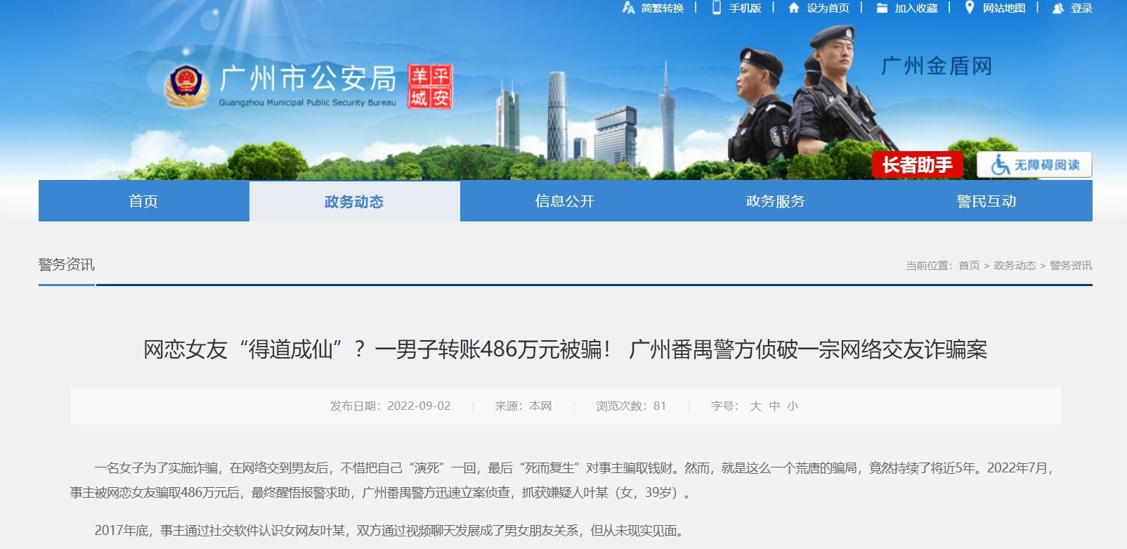 網上情緣古惑多,廣東有騙徒還「解鎖」仙俠劇情節,聲稱自己死過翻生,「得道成仙」,以「積善消災」等名義向「網戀男友」索取金錢。愛「女友」愛得死心塌地的男事主,對女友「復活」一事深信不疑,2018年起陸續向其轉帳總共486萬元(人民幣,下同),直到今年4月被對方封鎖微信後,還等到7月中才相信自己受騙,向警方求助。