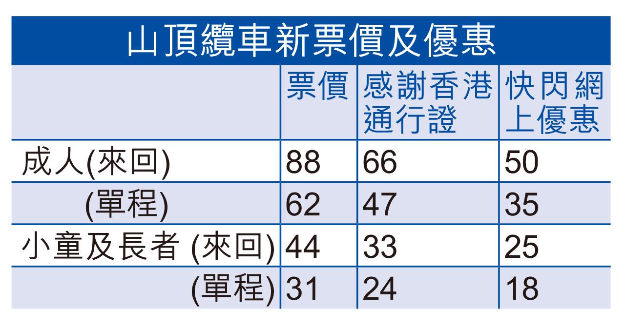 翻查資料,山頂纜車對上一次加價為2018年,成人單程收37元,來回票52元;3至11歲小童、65歲或以上長者單程收14元,來回23元。營運山頂纜車的香港上海大酒店有限公司昨宣布第六代電車將投入服務,亦公布最新票價成人單程升至62元,來回88元,分別升67.6%及69.2%,長者及小童票價,單程由14加至31元,來回由23升至44元,升幅分別逾一倍及九成一。
