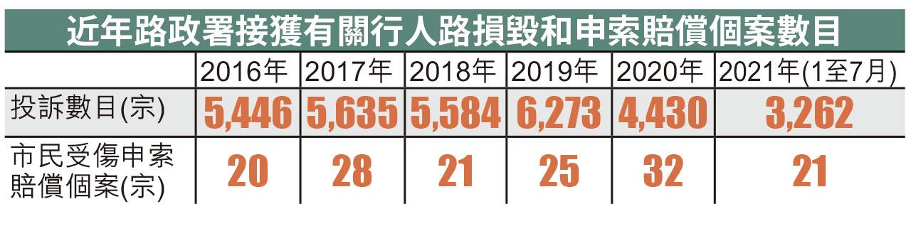 近年路政署接獲有關行人路損毀和申索賠償個案數目