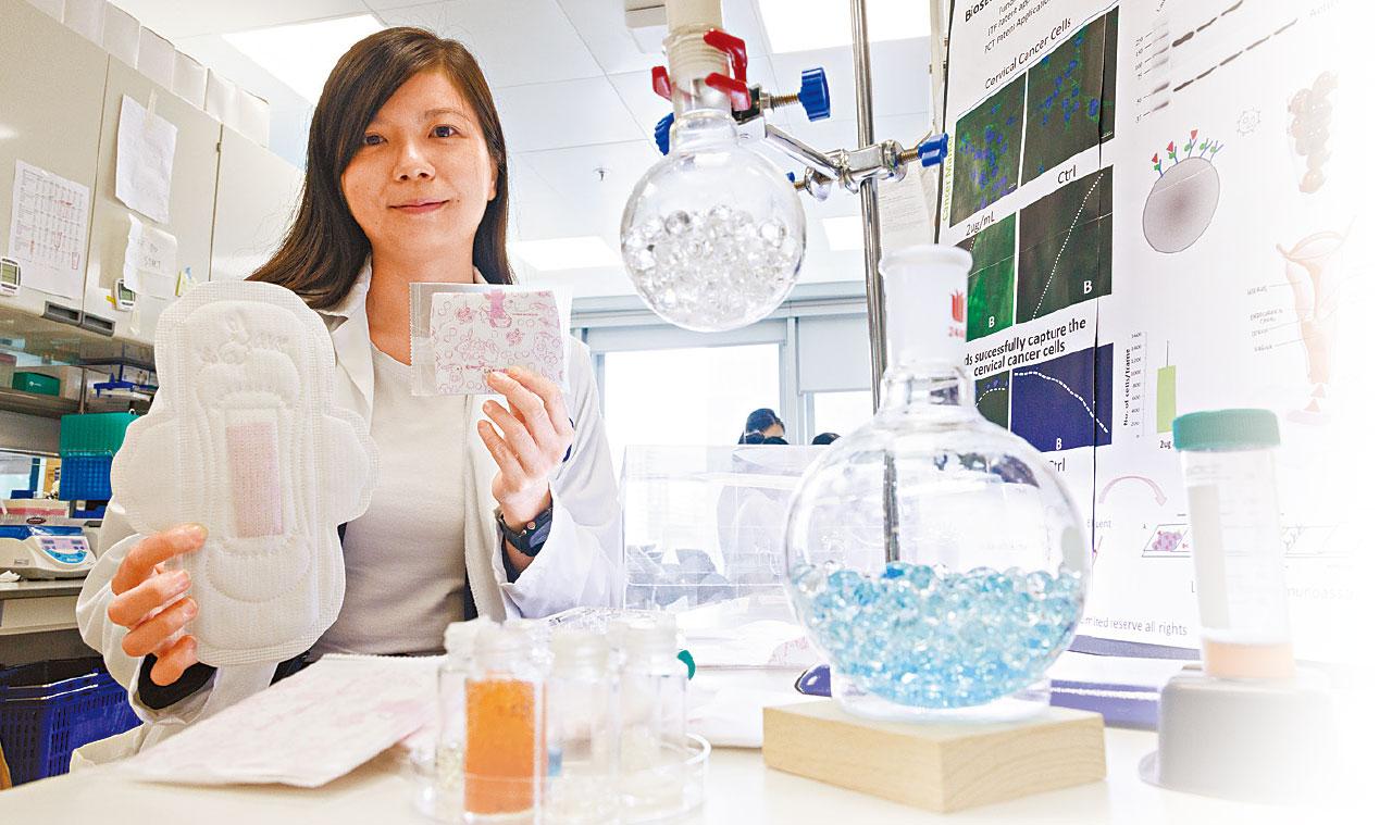 子宮頸癌是亞洲女性第三常見的癌症類型,雖然現時可以抹片檢測,但因屬入侵式,部分女性會因尷尬和不便而卻步。女科學家蔡佩樺研發利用經血檢測子宮頸癌的創新技術,預料準確度達七至八成;為有效和衛生收集經血,並發明了承載生物感應片的獨特衛生巾,婦女經期時使用指定衛生巾後再送到實驗室化驗,盼簡單的採樣方法可鼓勵婦女定期檢測,及早發現病症和治療,預計3年內可完成臨床測試並推出市面。