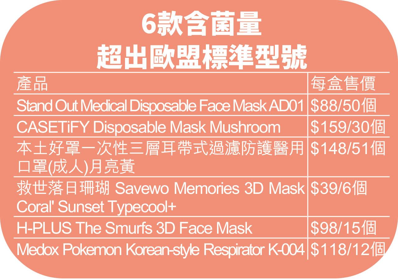 口罩作為防疫用品,但測試發現有6款反而藏菌,長期佩戴或致皮膚不適,甚至對免疫力較差人士造成健康風險。會方參考歐盟相關標準,發現有6款型號每克細菌菌落總數高於限量的30,分別為「Stand Out」、「CASETiFY」、「本土好罩」、「救世」、「H-PLUS」及「Medox」,每克細菌菌落總數由65.1至219.9,當中平均每個售5.3元的「CASETiFY」最高,超標逾6倍。
