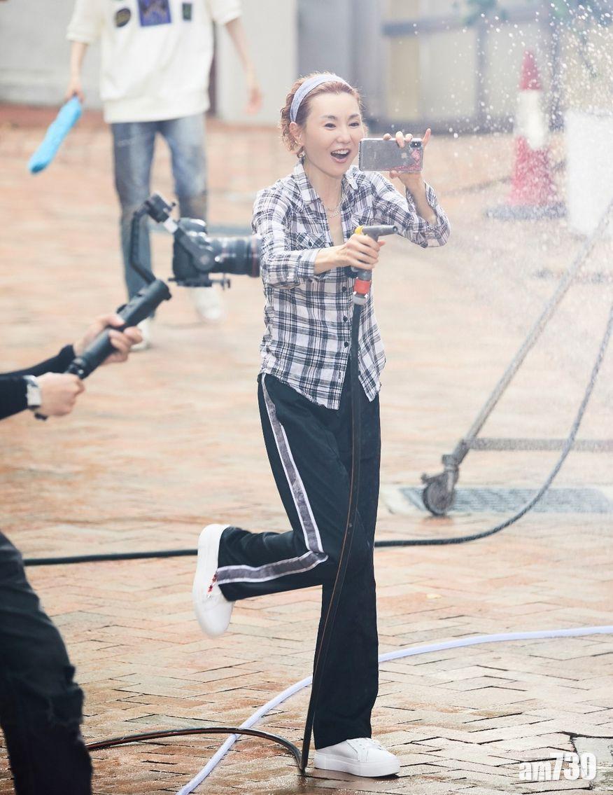 身穿長袖格仔恤衫、黑色運動褲,搭配白色波鞋,戴著藍色頭箍的Maggie,造型青春,她一時拿著手機拍照,一時拿着水喉管與徒弟玩水戰,玩到全身濕晒身勁興奮,少女心返晒嚟,一臉燦爛笑容,期間又舉起手機拍低徒弟的玩水實況,連她都笑自己是:「玩得最瘋的一次。」