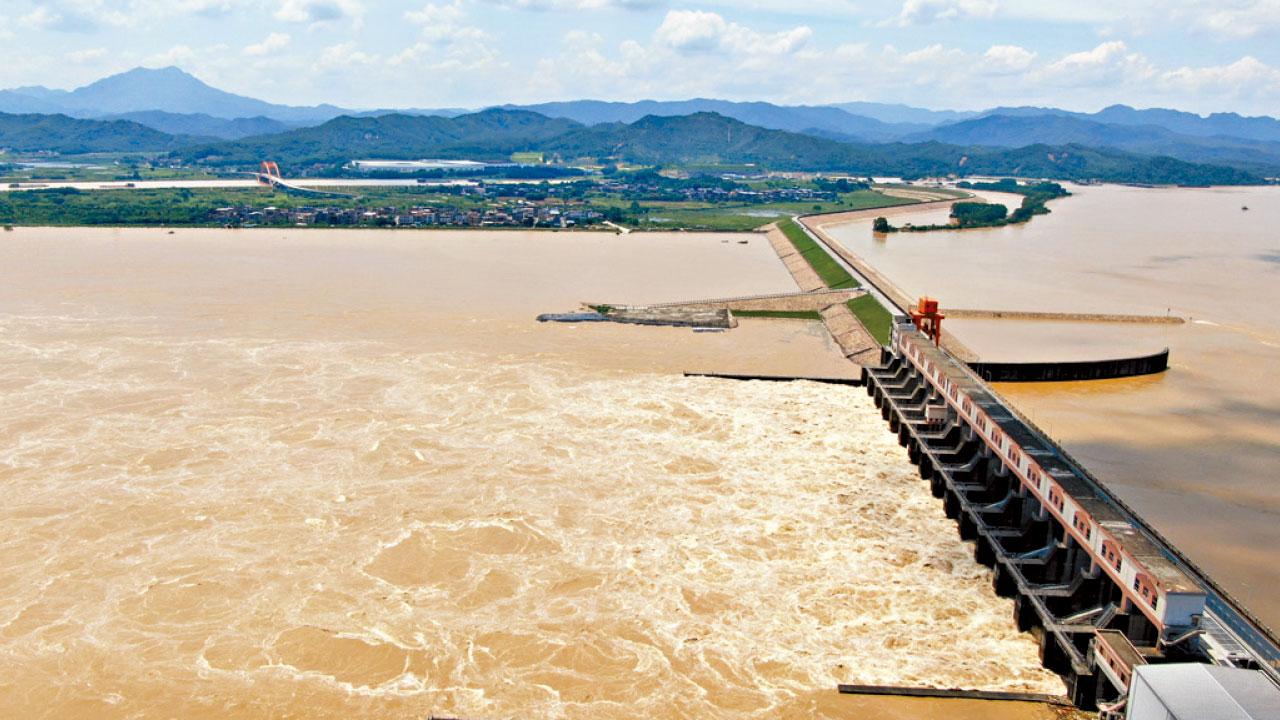 英德下游清遠飛來峽水利樞紐15孔全開,全力洩洪。(中新社)