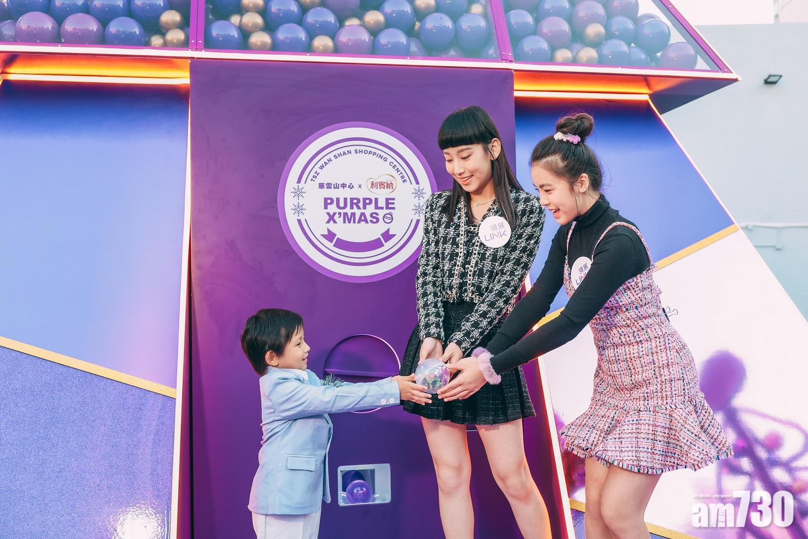 炎明熹與姚焯菲在高逾5米的聖誕扭蛋樹前打卡。