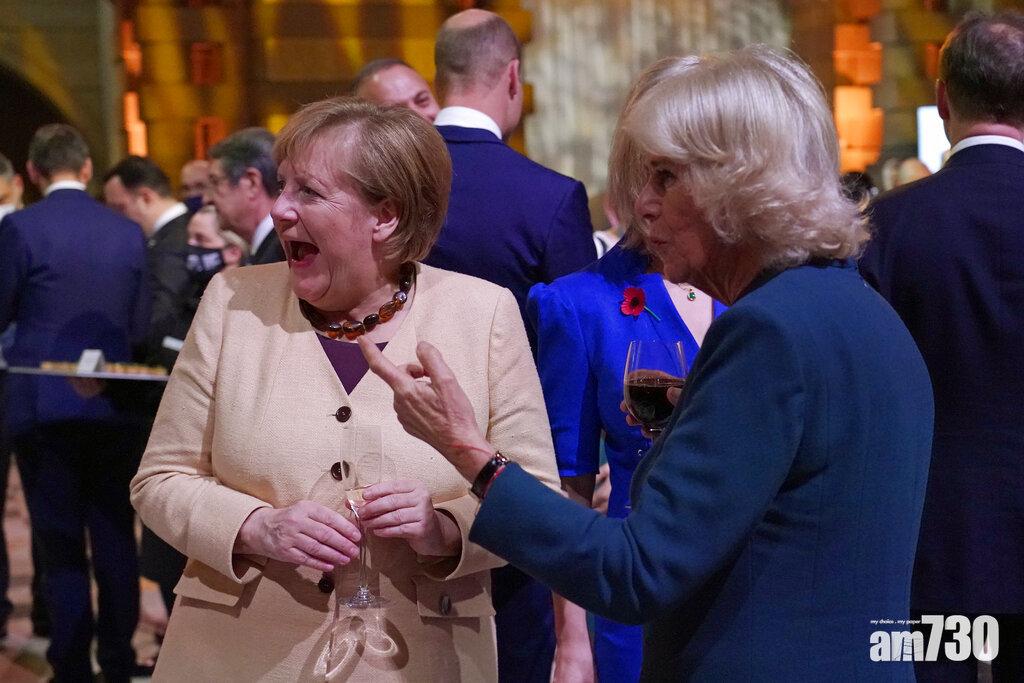 卡米拉上周一在峰會接待會上,與德國總理默克爾傾談。(美聯社)
