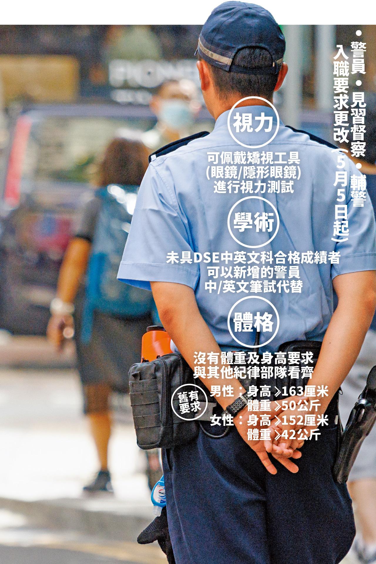 資料顯示,警隊有超過5,000個職位空缺,警方於剛過去的2022至23年度,取錄554名警員及165名督察,較前一年度回升,但仍未回復至2019年前的水平。警方表示,為提升招聘效率及保持競爭力,將於明日起放寬入職要求(見表),包括取消投考警員、見習督察及輔警的最低身高及體重要求,與其他紀律部隊看齊。投考者亦可戴眼鏡,或隱形眼鏡做視力測試,取消以往不戴矯視工具驗眼的要求。