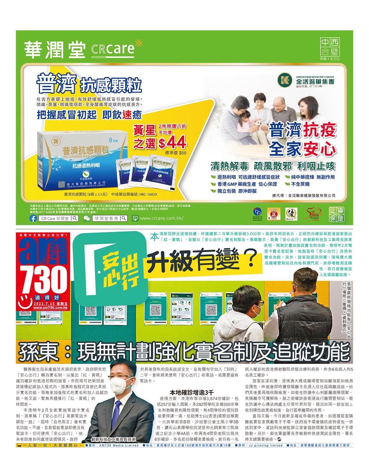 本港新冠肺炎疫情持續,昨連續第二日單日確診破3,000宗。政府本周初表示,正研究向確診和抵港旅客發出「紅、黃碼」,並擬以「安心出行」實名制配合。事隔數日,負責「安心出行」的創新科技及工業局長孫東表明,現無計劃加強其實名制功能,惟明年2月電話卡實名登記後,他指屆時「安心出行」自然有實名功能。另外,旅客取道深圳灣、港珠澳大橋或機場管制站往內地和澳門前,如即場檢測呈陽性,即日起會被送入社區隔離設施。