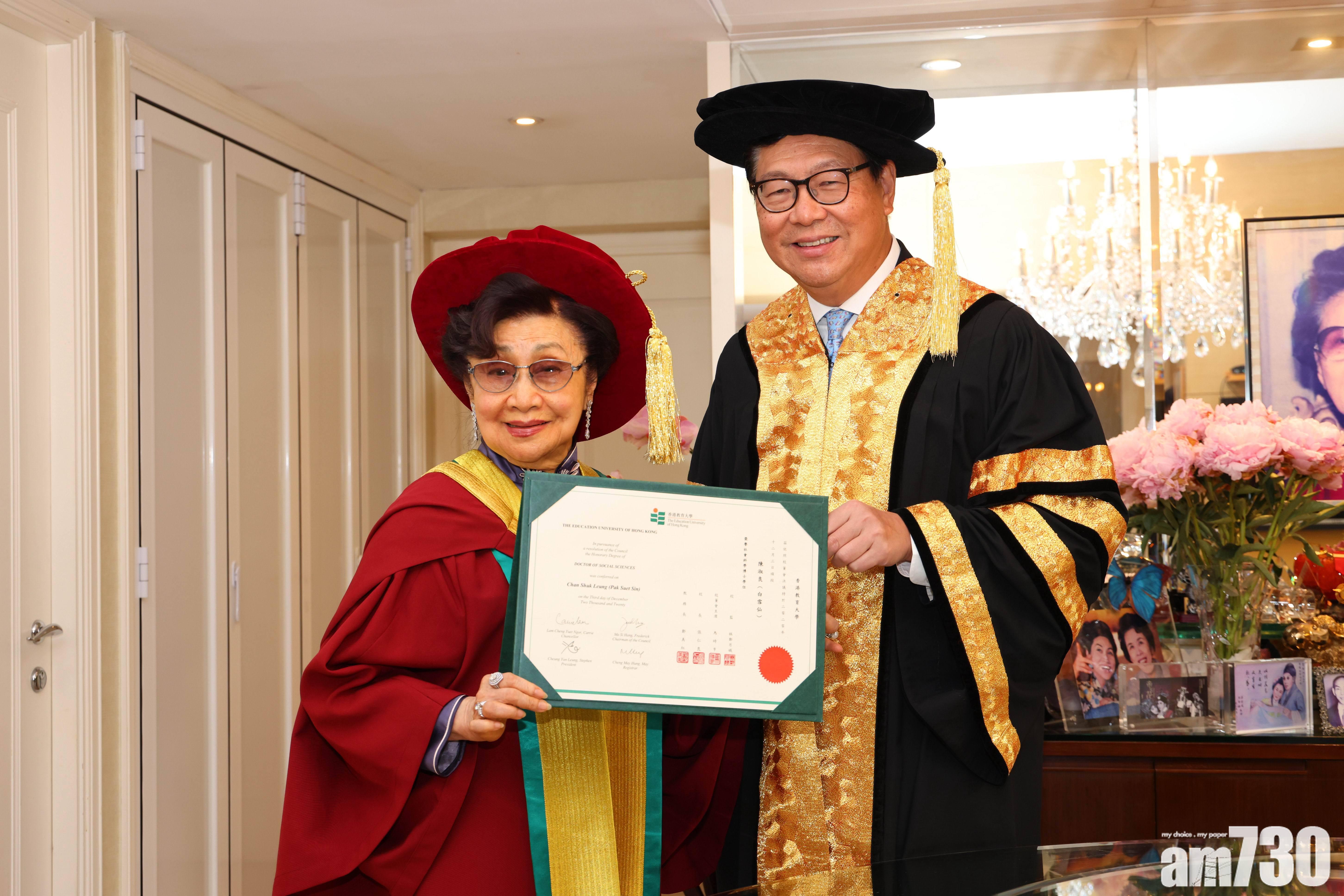 粵劇名伶白雪仙(原名陳淑良)今日獲香港教育大學 頒授榮譽博士學位。 馬時亨表示,仙姐在粵劇界貢獻良多,其非凡成就及無私奉獻,值得致以最崇高的敬意。他說:「仙姐是粵劇界殿堂級人物,她多年來不遺餘力,栽培後學,使梨園熠燿生輝,並得以蓬勃發展、生生不息。」
