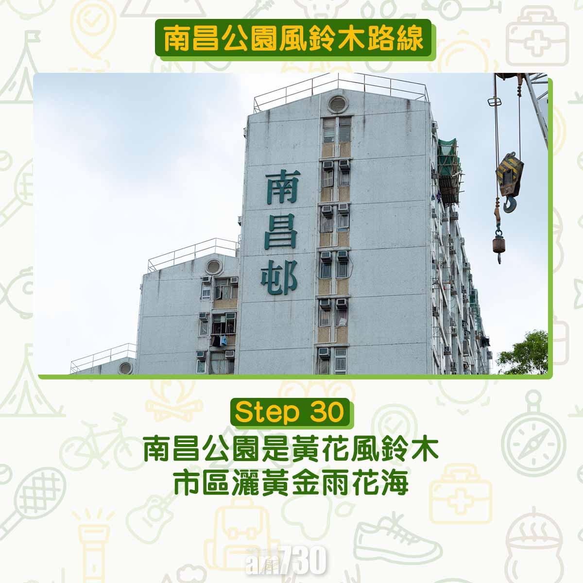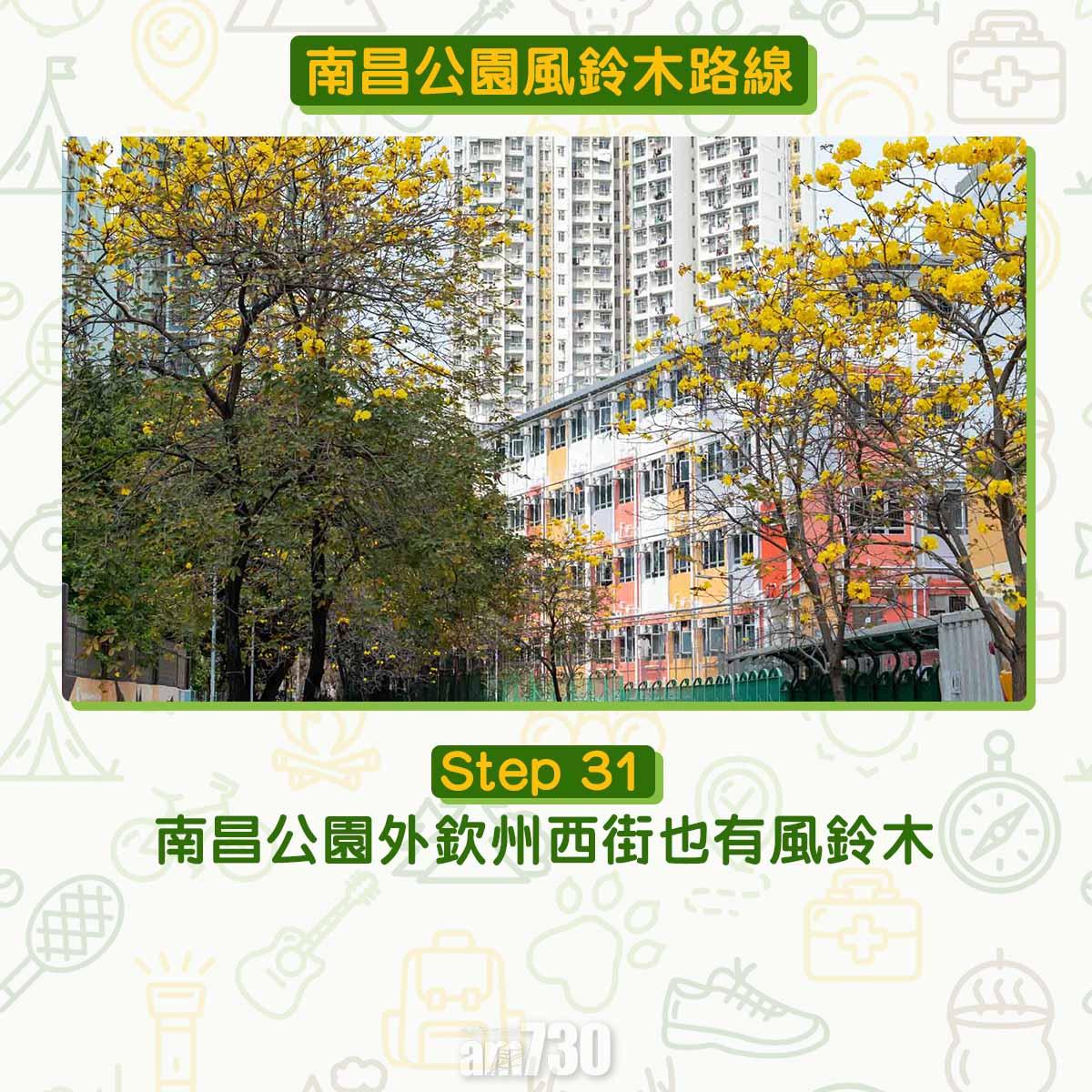 位於南昌站及深水埗間的南昌公園在1998年7月啟用,約4.74公頃佔地種植了數十棵黃花風鈴木,另有數棵紅花風鈴木。風鈴木分佈在圓形廣場及兒童三輪車遊樂區一帶,而整個公園甚至都公園外圍的欽州西街都有黃花風鈴木。黃鐘木又名黃花風鈴木,是南美洲委內瑞拉國樹,屬落葉喬木,花葉不相見。至於紅花風鈴木又名巴拉圭風鈴木,是薩爾瓦多國花。風鈴木花期由3至4月,風鈴木花期短,開花為時約一兩周內就凋謝,所以想與黃金雨花海打卡,就要把握時間。