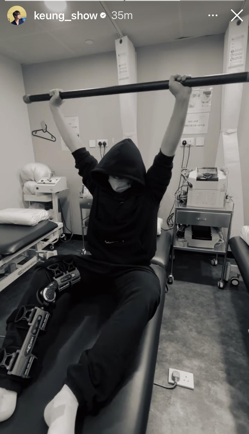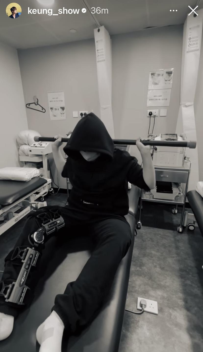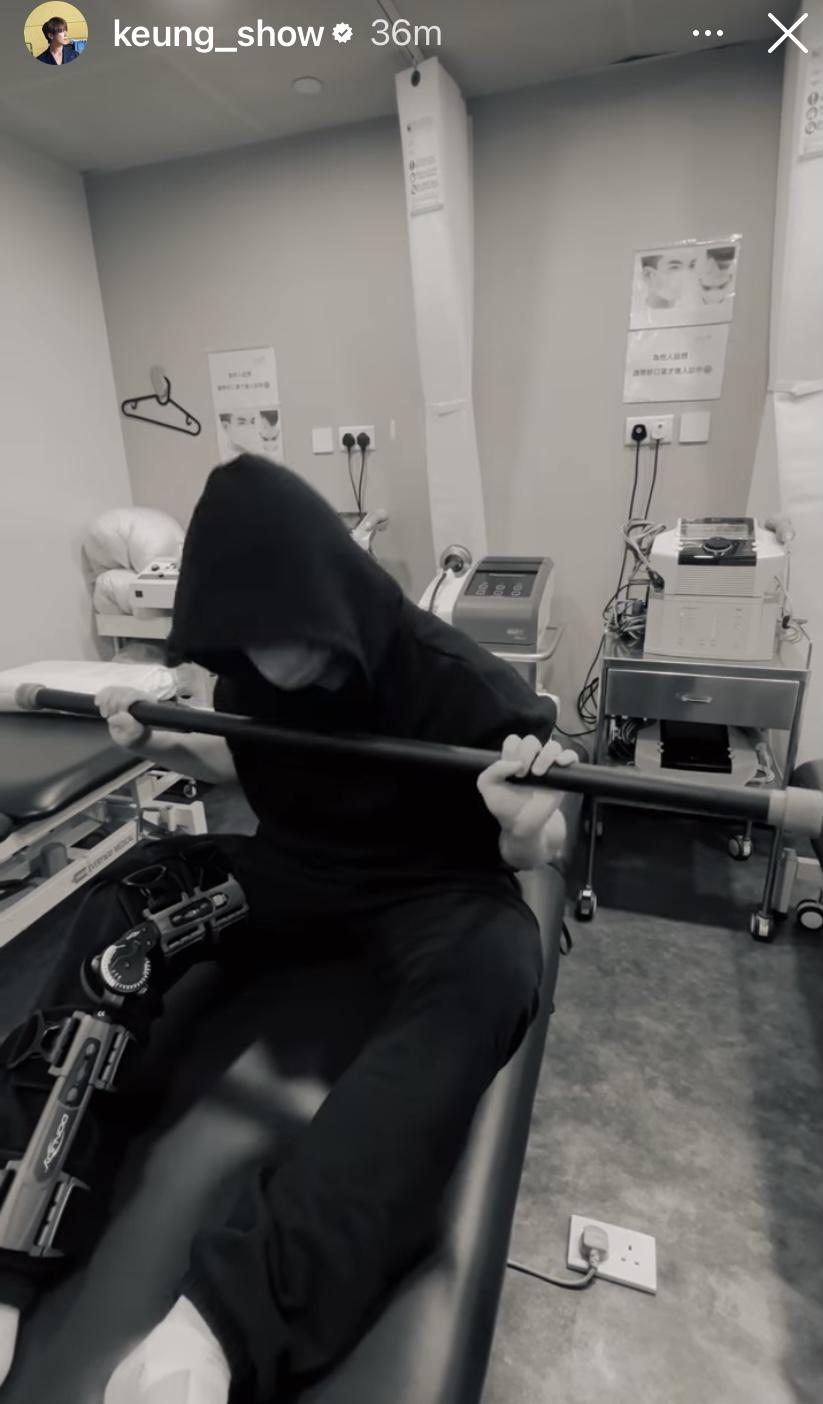 姜濤今早8點幾已接受物理治療。右膝蓋裝上固定支架,按指示努力地拉扯橡筋。