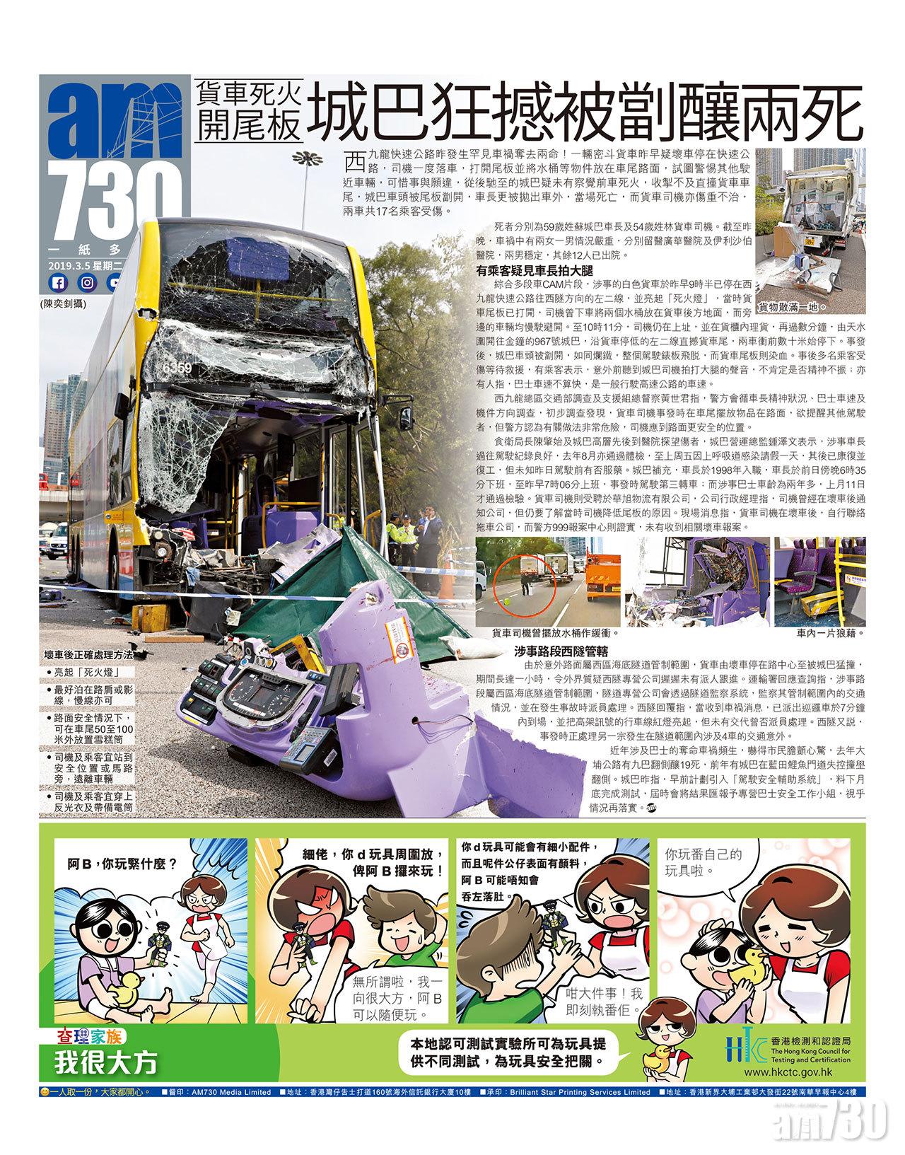 西九龍快速公路昨發生罕見車禍奪去兩命!一輛密斗貨車昨早疑壞車停在快速公路,司機一度落車,打開尾板並將水桶等物件放在車尾路面,試圖警惕其他駛近車輛,可惜事與願違,從後馳至的城巴疑未有察覺前車死火,收掣不及直撞貨車車尾,城巴車頭被尾板劏開,車長更被拋出車外,當場死亡,而貨車司機亦傷重不治,兩車共17名乘客受傷。