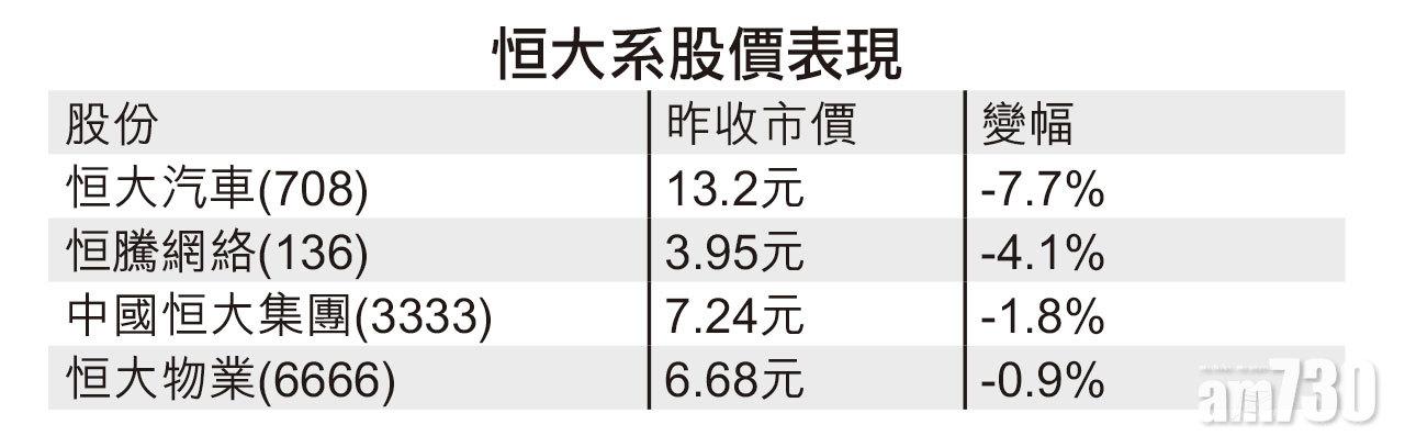 恒大系股價續跌,恒大昨先升後跌,收市報7.24元,挫1.8%,成交額5.8億元。恒大汽車(708)再瀉7.7%,收報13.2元,成交3.8億元,連跌8個交易日累瀉約52%,市值累計蒸發逾1,377億元。