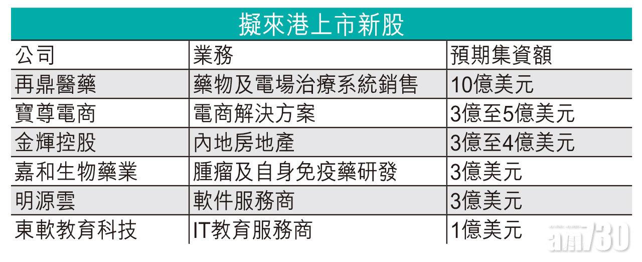 至於新股登場消息不絕,樂享互動(2707)將於明日招股,擬籌約2億美元(約15.6億港元)外,最少6間公司謀來港上市,集資額或達28億美元(約218億港元),外電指,在內地房地產500強排第36位的金輝控股擬於下周尋求港交所(388)上市聆訊,擬籌介乎3億至4億美元(約23.4億至31.2億港元),資料顯示,該集團結轉面積上升,營業收入連升兩年,至去年度約258億元人民幣,毛利率24.2%,於去年底土儲的計容建築面積436.58萬方米。其他包括從事醫療和資訊科技相關公司。此外,傳兩間飲料連鎖店喜茶及奈雪的茶謀明年來港上市,各籌4億至5億美元,但後者已向內地傳媒指現時沒有上市計劃。