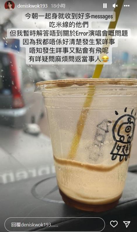 193期後在IG限時回覆︰「今朝一起身就收到好多messages,吃米線的他們。(痴X線的他們)但我暫時解答唔到關於ERROR演唱會問題,因為我都唔係好清楚發生緊咩事,唔知發生咩事又點會有飛呢?有咩疑問麻煩問返當事人。」