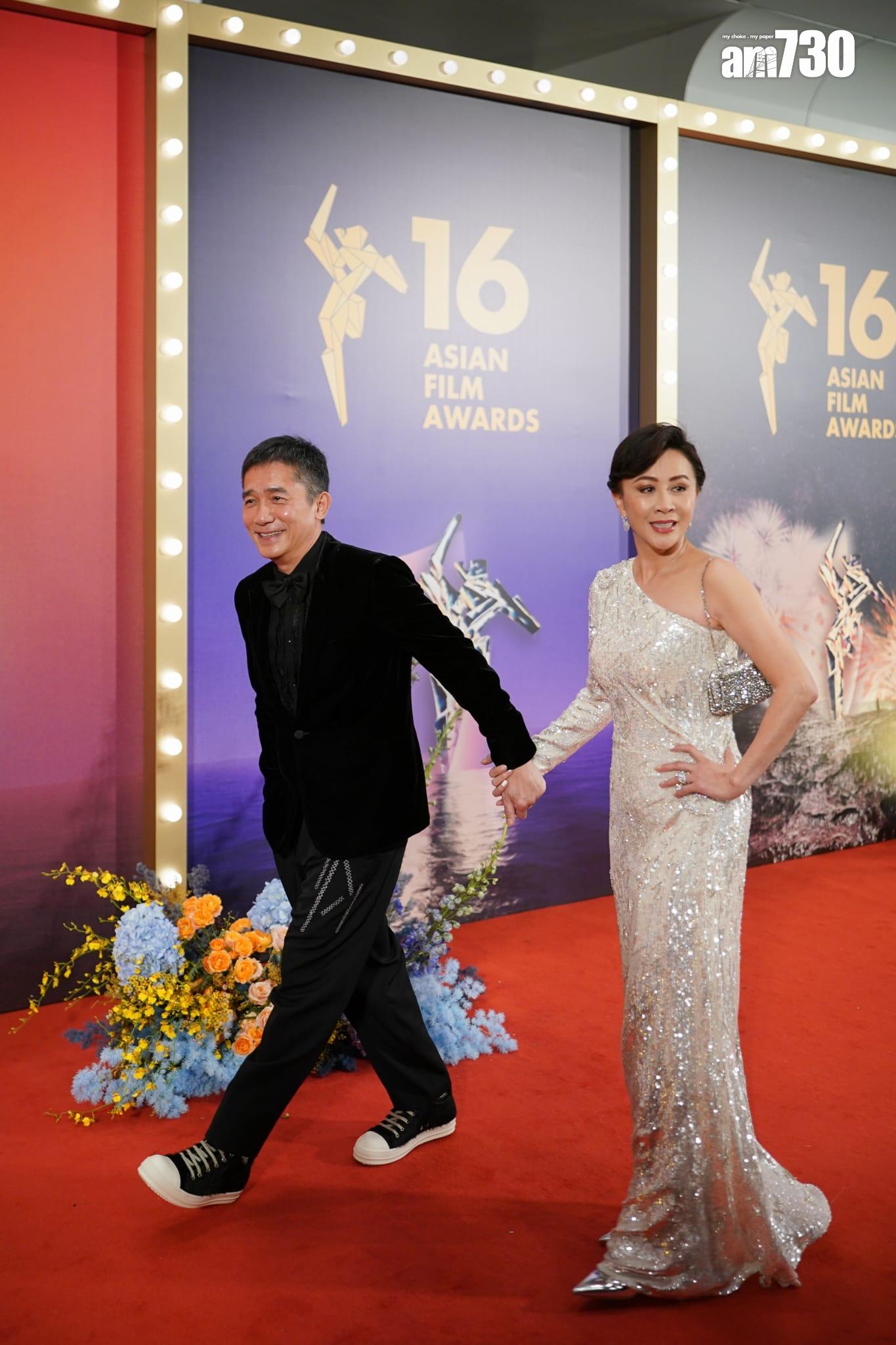梁朝偉與劉嘉玲雙雙出席《第16屆亞洲電影大獎》,他們以一黑一白的打扮踏上紅地氈,偉仔以波鞋配西裝上陣,而嘉玲就以單肩禮服示人。提到偉仔成為不少來賓的集郵對象,他表示很開心,並笑言今次很多參賽者都是他很喜歡的電影工作者。
