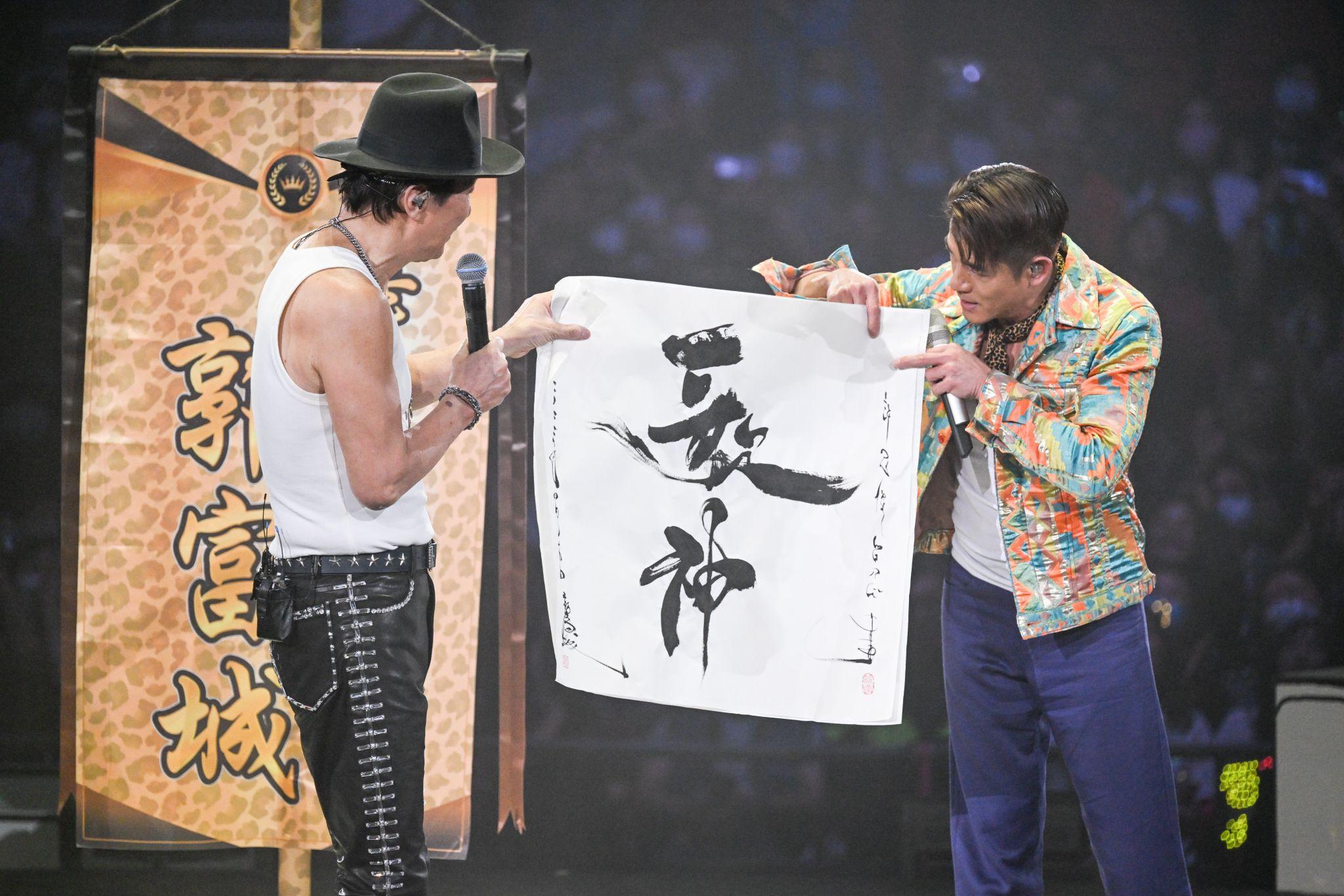 首六場演唱會嘉賓唱完第二首歌後便會離開舞台,但昨晚Sam和Aaron唱罷《沉默是金》後,Sam特別送了一幅綉上「舞台皇者 郭富城」這七個字的巨型錦旗給Aaron,Aaron表示受之有愧,他說看到Sam那種動力,又懂作曲和填詞,自己則只是寫過一首歌,希望將來會再嘗試作曲,也要像Sam那麼叻,自己作詞,會一直俾心機,他更說這幅錦旗是由Sam哥送,一定要放在門口。Aaron說:「我也預備了一份禮物給Sam哥你,我沒有告訴任何人的,但希望你會喜歡這一份禮物。在疫情開始後,除了那個網上演唱會外,這三年我也沒有做過演唱會,在這段時間我去了學書法,今天在家即興寫了這張書法給Sam哥。」Aaron 接著把那張寫上「歌神」兩字的墨寶給Sam,Sam連聲讚好,最後Aaron非常投入地多唱一首《打雀英雄傳》後,便把舞台交回給Sam,讓他可以把最後一晚的點唱環節帶給現場觀眾,Sam亦依依不捨的盡量滿足歌迷的要求,最後encore了兩次,與全場一起大合唱至凌晨。讓大家離場時感覺滿載而歸。