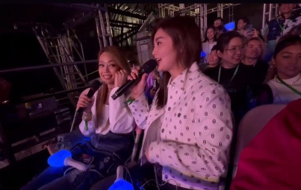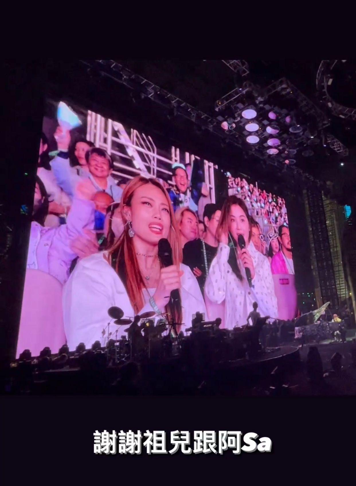 昨晚演唱會,周杰倫表示已經很久沒有來香港演出,接着賣關子說:「那我們接下來要唱甚麼歌曲呢?今天聽說有……」話還沒講完,鏡頭突然轉到台下,正對着坐在觀眾席的的祖兒和阿Sa,現場立刻尖叫聲不絕。周董跟二人打招呼,並表示:「好久不見祖兒和阿Sa,Hello!」兩人即回應:「杰倫,好帥喔!」經一輪互動之後,周董再問:「妳們還有再繼續聽我的歌嗎?」兩人異口同聲說:「有啊!」又被周董逼問:「我最近有出新專輯妳們知道嗎?妳們覺得新歌好聽還是老歌好聽?」祖兒與阿Sa大笑:「都好!」周董又說:「哇,我就是要等這句話。」兩人之後即場點唱對方的歌曲《明明就》。周杰倫曾在2007年演唱會上,曾邀請Twins擔任表演嘉賓,及後於2013年的個唱上再請來祖兒站台,亦為祖兒寫過歌曲《小小》,雖然祖兒與阿Sa今次沒有上台大展歌喉,但三人的驚喜互動已讓現場觀眾大感驚喜。完騷後,周杰倫在IG限時動態貼出祖兒、阿Sa及鄭志剛的影片。