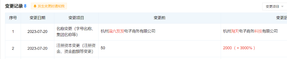 企業名稱更改為「杭州淘天電子商務科技有限公司」,並同時將註冊資本由50萬元增至2,000萬元人民幣,增幅39倍。