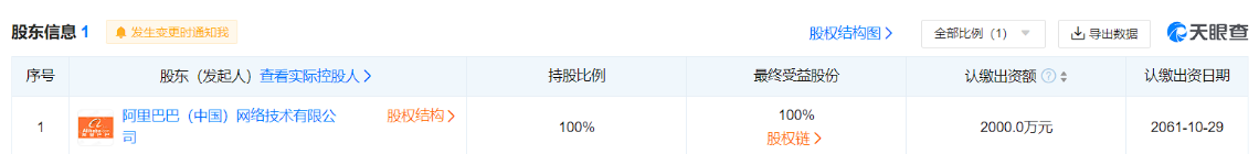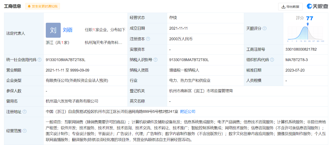 報道亦引述天眼查App內資料顯示,公司成立於2021年11月,由阿里巴巴(中國)網絡技術有限公司全資持股。而法定代表人為劉蓓,經營範圍包含互聯網銷售、電子產品銷售、軟件開發、數字文化創意內容應用服務、個人互聯網直播服務等。
