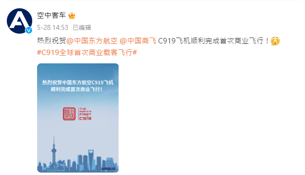 上周日(5月28日)當日,波音曾在微博發文,祝賀中國國產大飛機C919完成商業航班首飛,而中國商飛公司當時亦在評論區表示感謝;而另一飛機製造商空中巴士亦有發文祝賀。