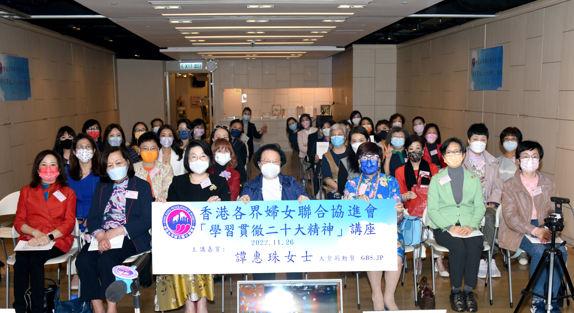 第二場講座,則於11月26日完成,副主席暨社會及法律事務委員會召集人蔡關頴琴主持「學習貫徹二十大精神」講座,邀得全國人民代表大會香港特別行政區基本法委員會副主任、前港區全國人大代表譚惠珠分享二十大精神見解和心得,譚惠珠闡釋二十大報告中給香港的啟示,同時針對報告中「中國式現代化」、「高質量發展」、「民生福祉」、「國家安全」等關鍵詞分享真知灼見及精彩解說。活動參與總人數約130人,包括近60位香港婦協顧問、理事會成員及團體會員代表現場出席活動;亦有近50位參加者在香港天津工商專業婦女委員會、荃灣葵青區婦女會、赤柱婦女會三間團體會員及友好團體香港東莞清溪同鄉會的分會場線上參與;另外還有多個團體會員參與者通過網上觀看直播,令各界對全面落實「一國兩制」、充份發揮「一國兩制」的特質優勢有更深刻認識。