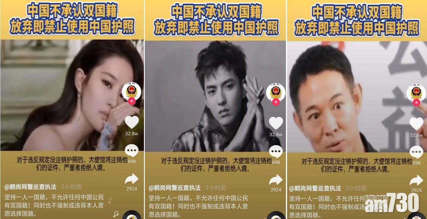 內地不允許公民擁有雙重國籍,但不少藝人「側側膊」,取得外國國籍後還在使用中國護照,黑龍江鶴崗市網警今日在短片平台上載一條「教育」短片,以劉亦菲、吳亦凡及李連杰做例子,強調「中國不承認雙國籍,放棄(中國籍)即禁止使用中國護照。對於違反規定沒註銷護照的,大使館將註銷他們的證件,嚴重者拒絕入境」,呼籲「堅持一人一國籍」,又指「不強制或違背本人意願選擇國籍」。