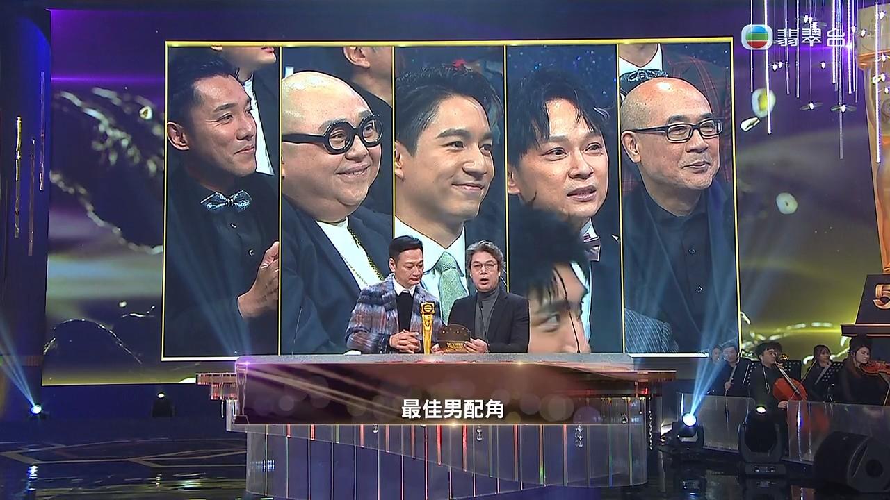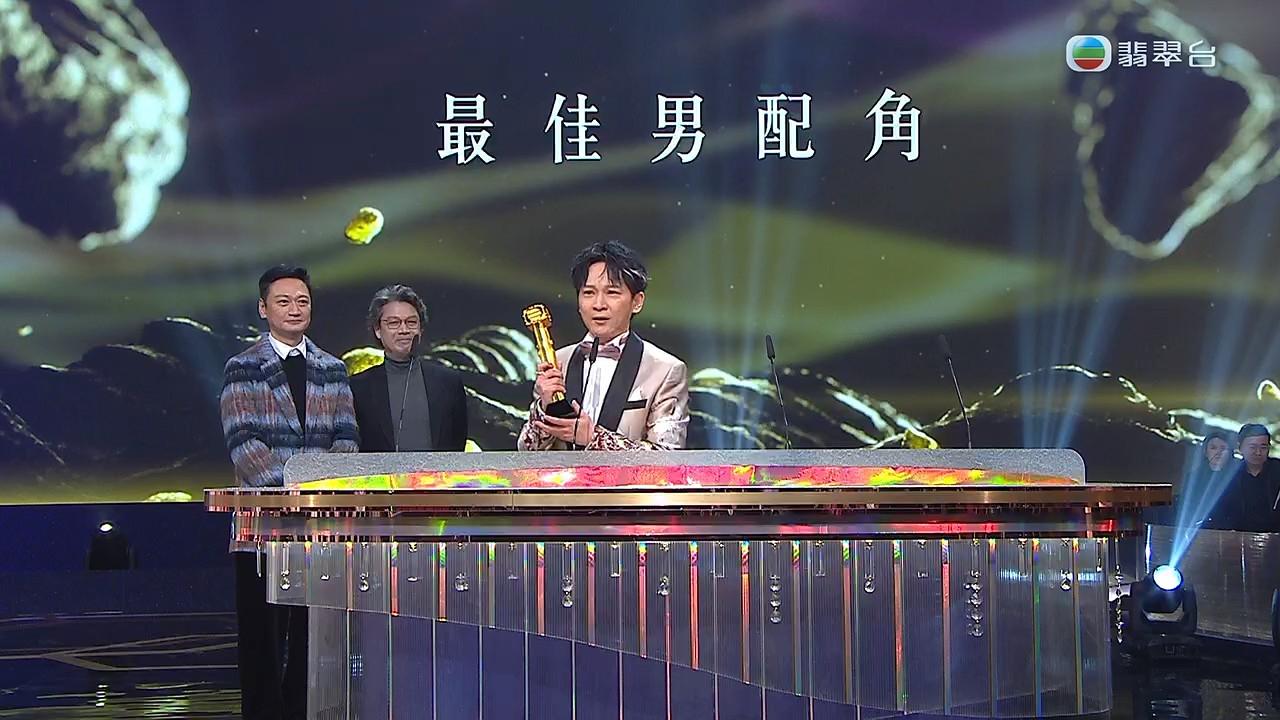 男配角由《下流上車族》的鄧智堅獲得,他聽到自己的名字時一度來不及反應,當場哭了出來,觀眾席上多位男演員起立為他拍掌。他領過獎項之後,心情終於平伏並逐一致謝,他說︰「多謝每一位投票嘅觀眾,多謝每一位演員同幕後兄弟姊妹,我相信今次第一次合作就咁有火花,全因演員多年堅守嘅修行,多謝演藝學院……」在觀眾席上的江美儀亦忍不住眼濕濕。
