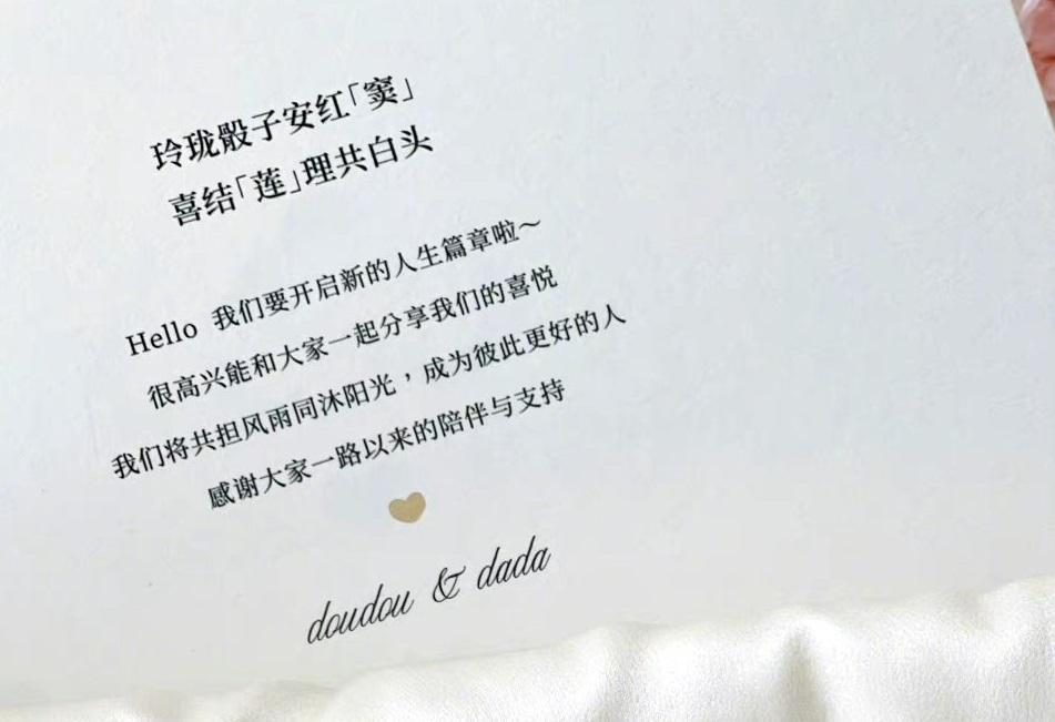 近日網上有多張婚禮場地的照片流出,當地有遊客見到竇驍在場打點,更見到超蓮穿上簡約款式的婚紗。他們的回禮禮物亦已在網上曝光,禮盒有奢華品牌的護膚霜、香水、朱古力及絲質眼罩和布鞋。收納袋更有二人的泳裝Q版公仔,並以「DouDou & Dada」自稱,心意卡上更印有用他們名字的詩句︰「玲瓏骰子安紅『竇』,喜結『蓮』理共白頭。Hello我們要開啟新的人生篇章啦~很高興能和大家分享我們的喜悅。我們將共擔風雨同沐陽光,成為彼此更好的人。感謝大家一路以來的陪伴和支持。doudou(竇竇)&dada(Linda)上。」