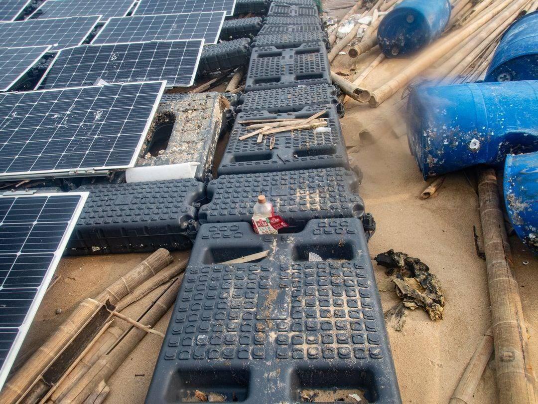 海上驚現逾百塊太陽能板?昨日(27日)關注海洋生態的Facebook專頁「海洋拾荒者Kitti」發文指,屯門龍鼓灘西面海域的海岸公園岸邊,出現大批廢棄太陽能板。根據相片所見,現場有200多塊太陽能板被繫於膠板上,連同一批竹枝浮於海面,當中夾雜簡體字包裝的紅色膠水樽,附近亦有一批垃圾,未知是否屬惡意棄置。
