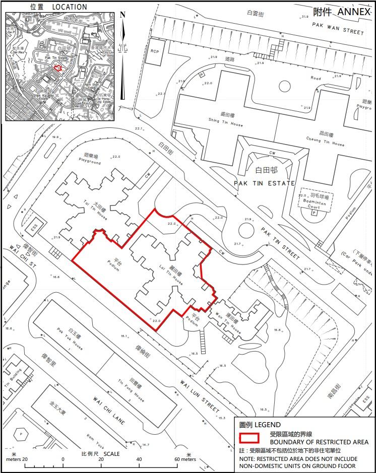 政府圍封深水埗白田邨麗田樓,不包括位於地下的非住宅單位。(政府新聞處圖片)