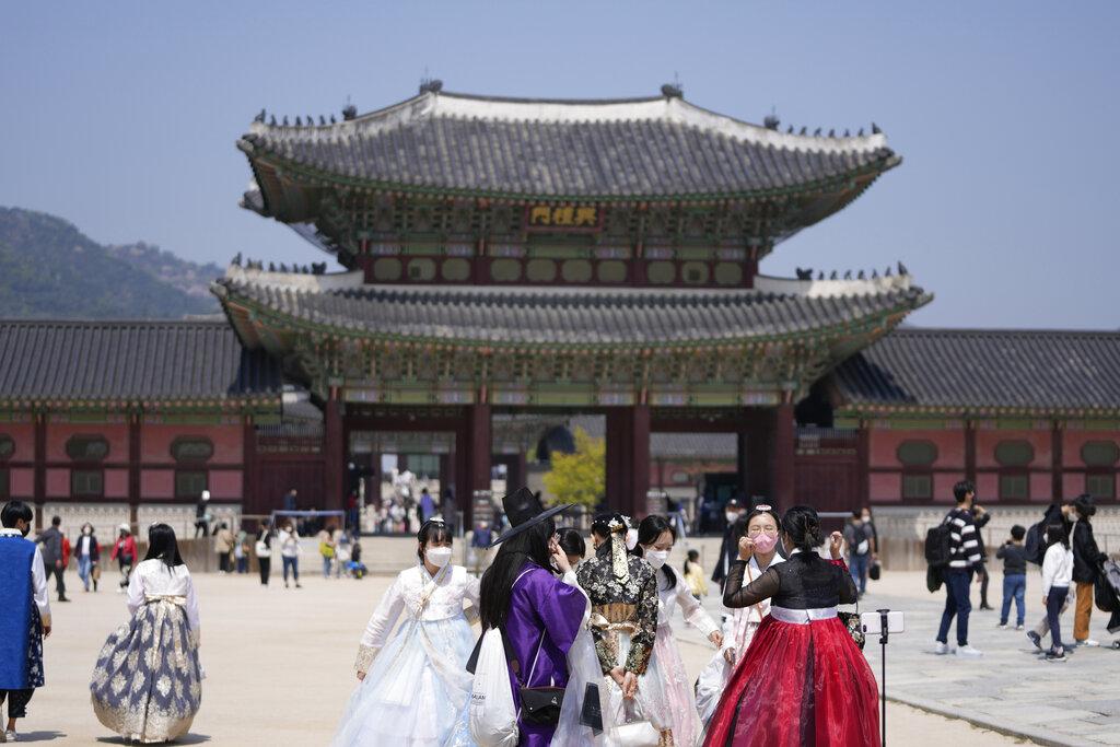 首爾民眾周日到景福宮暢遊。(美聯社)