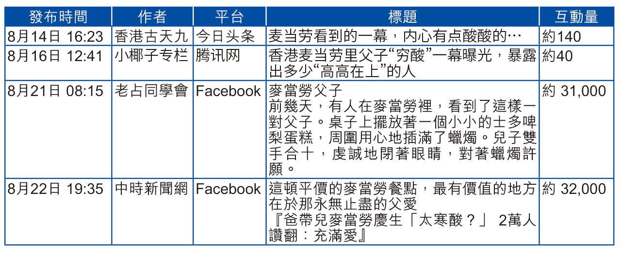 源頭帖子找到了,是來自「今日头条」平台上一個有19萬粉絲的「香港古天九」帳號,帖文發於8月14日16:23標題為「麦当劳看到的一幕,内心有点酸酸的…」,內容未有提到照片是攝於香港,只是放了「很想回到童年#生活##香港#」等標籤。該貼反應一般只有144條評論,很多問及作者為甚麼心酸,他的解釋是「在孩子看來,這是非常快樂的時刻,他感受到了爸爸的愛,也吃了自己喜歡吃的東西」。